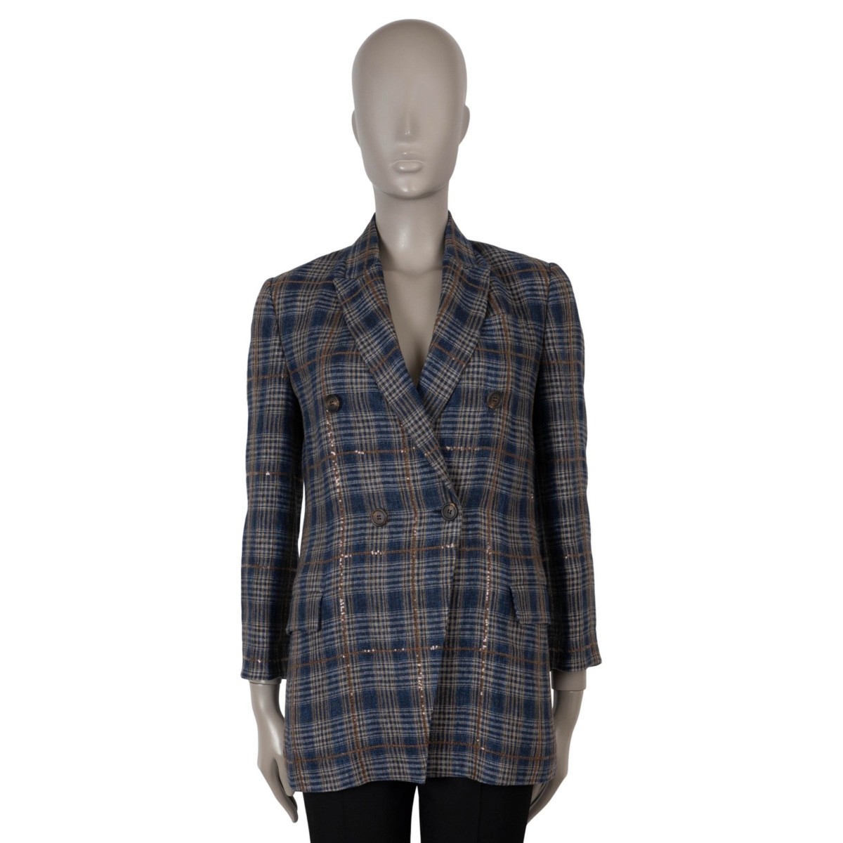 Welcome to LUX l Authentic Designer ConsignmentRämistrasse 25, 8001 Zürich, Switzerland I Tue-Fri 11-18:30 & Sat 11-16:00By bidding on our auctions you are agreeing to our Terms and Conditions below.All items come with authenticity guarantee!------------------------------------------------------------------------------------------------------------------------------------------ Product DescriptionThis 100% authentic Brunello Cucinelli asymmetric blazer is crafted in navy blue, beige, cognac and white plaid linen (100%) with subtle micro-sequin accents embroidered through the pattern. It features a tailored, slightly fitted silhouette with peak lapels, two flap pockets and softly cropped 3/4 sleeves. The double-breasted front closes with horn buttons, and the interior is lined in cupro (100%). Complete the look with the matching pants available in a separate listing. Has been worn and is in excellent condition.    2018 Spring/SummerMeasurementsModel181 MF5488095 C001Tag Size40SizeSShoulder Width40cm (15.6in)Bust From94cm (36.7in)Waist From88cm (34.3in)Hips From102cm (39.8in)Length72cm (28.1in)Side Seam Length50cm (19.5in)Sleeve Length50cm (19.5in)ShopZurich - RämistrasseAll our listings include only the listed item unless otherwise specified in the description above - Price includes US tariffs - for all other countries price does not include import duties & taxes - check your countries import laws prior purchase------------------------------------------------------------------------------------------------------------------------------------------ Terms & Conditions Luxury-Shops is not affiliated with any of the name-brand items we offer for sale.Warranties and Liabilites: Luxury-Shops declines all responsibility and cannot be held liable for any damages caused by the use of a specific garment.We also cannot be held responsible for the quality of an item (we are not the manufacturer) or any damages resulting from a manufacturing defect.No warranties of any kind are given or implied.Condition of Merchandise: Luxury-Shops offers for sale luxury top-quality products. We fully disclose the condition of each item. In the description of each product, Luxury-Shops will specify the conditions if different from the standards set by the market (Required disclosure of prior use)The main characteristics of products are shown in great detail (through numerous photographs and in-depth descriptions). The products offered for sale MAY NOT correspond to the real garments in terms of image and color because of the Internet Browser or Monitor used (color calibration). Luxury-Shops disclaims all responsibility.Every used item offered by Luxury-Shops has been cleaned and restored to the best possible condition unless noted otherwise. Every used or vintage handbag has been polished and refinished. Your purchases will be sent to you ready to be used or worn.Please be aware that vintage items may be delicate and may not be as resilient as a brand-new item. Please take appropriate care when using a vintage item. Damage to items after receipt or use by customers is not the responsibility of Luxury-Shops.Luxury-Shops is a reseller of authentic designer and vintage merchandise. We are not an authorised dealer and are not affiliated with the brands we sell on our site. Store-new designer items are only available from an authorised dealer or the actual store. Once the item leaves the authorised dealer with a customer, the item is considered pre-owned. However, items can be pre-owned and in new condition - that is, never used by the owner. Below are the definitions of the descriptions we use.NEW: in new condition, that is, never used. This means the item may have been purchased by us from an authorized dealer or a store. New items may also be pre-owned, that is, purchased by one of our consignors and never used.  These items may hav…
