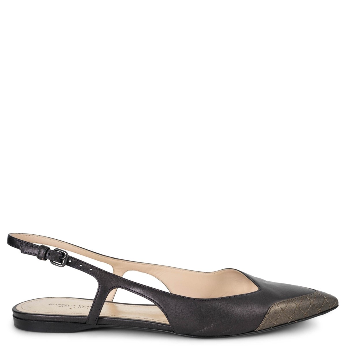 slingback flats in charcoal is crafted from smooth, high-quality leather for a sleek, minimalist finish. The elegant silhouette is elevated by a distinctive bronze metal toe tip with refined stitching detail, adding a subtle yet striking accent. Designed with a comfortable slingback strap, this flat embodies Bottega Veneta’s signature understated sophistication and modern craftsmanship—perfect for effortless day-to-evening wear. Have been worn and are in excellent condition. MeasurementsImprinted Size38Shoe Size38Inside Sole25cm (9.8in)Width7.5cm (2.9in)ShopZurich - RämistrasseAll our listings include only the listed item unless otherwise specified in the description above - Price includes US tariffs - for all other countries price does not include import duties & taxes - check your countries import laws prior purchase------------------------------------------------------------------------------------------------------------------------------------------ Terms & Conditions Luxury-Shops is not affiliated with any of the name-brand items we offer for sale.Warranties and Liabilites: Luxury-Shops declines all responsibility and cannot be held liable for any damages caused by the use of a specific garment.We also cannot be held responsible for the quality of an item (we are not the manufacturer) or any damages resulting from a manufacturing defect.No warranties of any kind are given or implied.Condition of Merchandise: Luxury-Shops offers for sale luxury top-quality products. We fully disclose the condition of each item. In the description of each product, Luxury-Shops will specify the conditions if different from the standards set by the market (Required disclosure of prior use)The main characteristics of products are shown in great detail (through numerous photographs and in-depth descriptions). The products offered for sale MAY NOT correspond to the real garments in terms of image and color because of the Internet Browser or Monitor used (color calibration). Luxury-Shops disclaims all responsibility.Every used item offered by Luxury-Shops has been cleaned and restored to the best possible condition unless noted otherwise. Every used or vintage handbag has been polished and refinished. Your purchases will be sent to you ready to be used or worn.Please be aware that vintage items may be delicate and may not be as resilient as a brand-new item. Please take appropriate care when using a vintage item. Damage to items after receipt or use by customers is not the responsibility of Luxury-Shops.Luxury-Shops is a reseller of authentic designer and vintage merchandise. We are not an authorised dealer and are not affiliated with the brands we sell on our site. Store-new designer items are only available from an authorised dealer or the actual store. Once the item leaves the authorised dealer with a customer, the item is considered pre-owned. However, items can be pre-owned and in new condition - that is, never used by the owner. Below are the definitions of the descriptions we use.NEW: in new condition, that is, never used. This means the item may have been purchased by us from an authorized dealer or a store. New items may also be pre-owned, that is, purchased by one of our consignors and never used. These items may have minor signs of handling as would any item available at an authorized dealer or boutique given that customers would reasonably handle an item when trying it on or examining it for purc…
