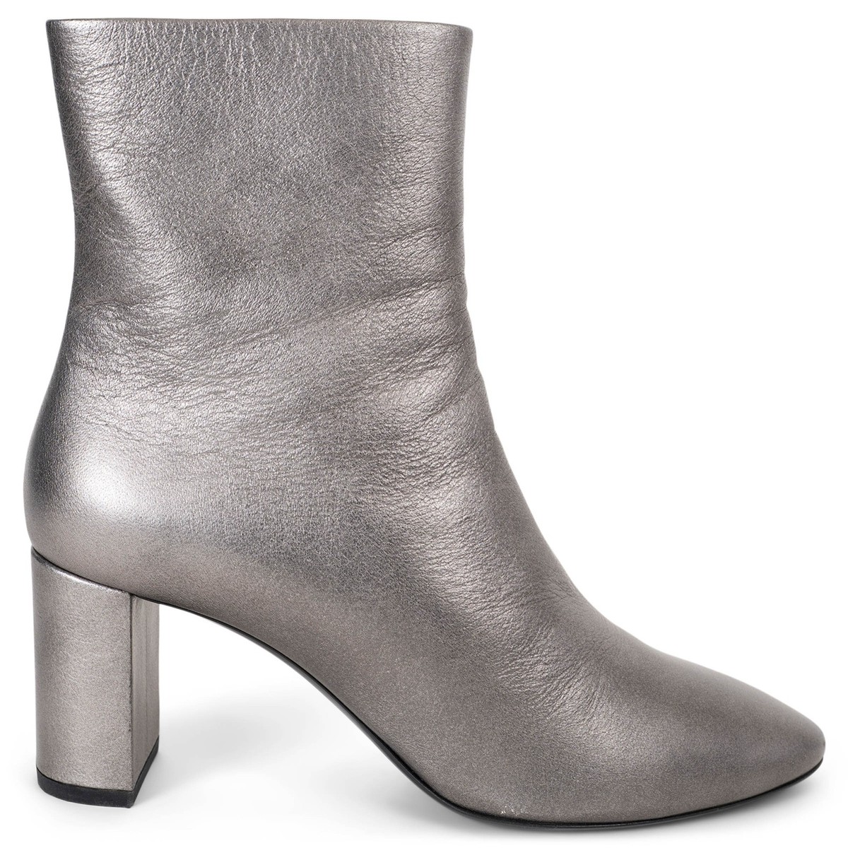 Saint Laurent Lou leather ankle boots in metallic grey offer a sleek, modern take on a classic silhouette. Crafted from smooth, lustrous leather, they feature feminine almond-shaped toes, sturdy block heels, and smooth leather outsoles for a refined finish. A versatile and elegant pair that adds subtle shine and timeless sophistication to any look. Have been worn and are in excellent condition.MeasurementsModel527520 0W400 Imprinted Size38.5Shoe Size38.5Inside Sole25.5cm (9.9in)Width7.5cm (2.9in)Heel7cm (2.7in)Shaft15cm (5.9in)Top Circumference25cm (9.8in)ShopZurich - RämistrasseAll our listings