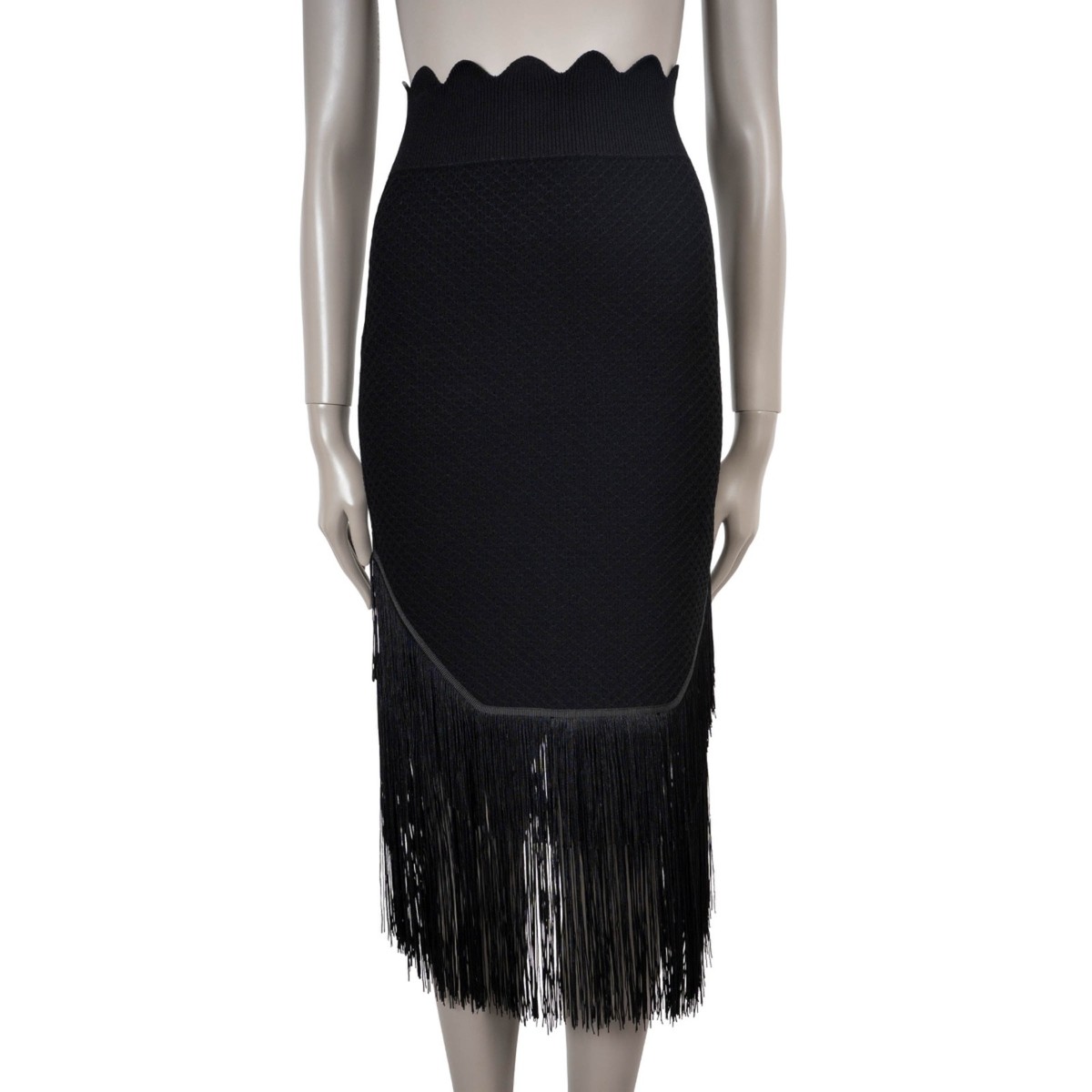 Dieser authentische Victoria Beckham Bleistiftrock vereint anspruchsvollen Stil mit fließender Bewegung. Hergestellt aus einer schwarzen Jacquard-Strickmischung aus Viskose (72%), Polyester (15%) und Elasthan (13%), verfügt er über einen dramatischen Fransenbesatz, der für dynamischen Schwung sorgt.