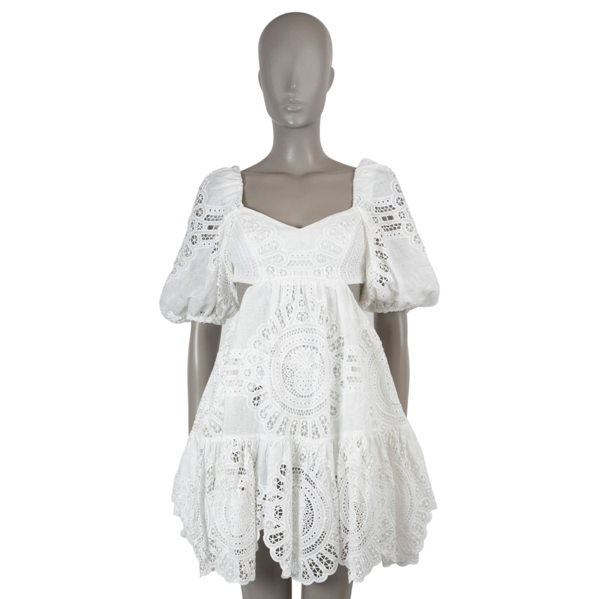 Welcome to LUX l Authentic Designer ConsignmentRämistrasse 25, 8001 Zürich, Switzerland I Tue-Fri 11-18:30 & Sat 11-16:00By bidding on our auctions you are agreeing to our Terms and Conditions below.All items come with authenticity guarantee!------------------------------------------------------------------------------------------------------------------------------------------ Product Description:100% authentic Zimmermann Vacay dress in cream broderie anglaise linen (100%). Features a refined fit-and-flare silhouette with a flattering mini length, designed with a sculpted cut-out bodice, feminine scoop neckline and short puff sleeves finished with elastic cuffs for soft volume. The intricately embroidered broderie anglaise is elevated by broad scalloping along the hemline, adding a romantic, artisanal finish, while the dress opens with a concealed zipper and ties at the back for a secure, elegant fit and is fully lined in cotton (100%) for comfort and structure. Has been worn and is in excellent condition.2023 Summer SwimMeasurementsTag SizeMissingSizeXSShoulder Width43cm (16.8in)Bust From68cm (26.5in)Waist From70cm (27.3in)Hips From88cm (34.3in)Length92cm (35.9in)Side Seam Length60cm (23.4in)Sleeve Length38cm (14.8in)ShopZurich - RämistrasseAll our listings include only the listed item unless otherwise specified in the description above - Price includes US tariffs - for all other countries price does not include import duties & taxes - check your countries import laws prior purchase------------------------------------------------------------------------------------------------------------------------------------------ Terms & Conditions Luxury-Shops is not affiliated with any of the name-brand items we offer for sale.Warranties and Liabilites: Luxury-Shops declines all responsibility and cannot be held liable for any damages caused by the use of a specific garment.We also cannot be held responsible for the quality of an item (we are not the manufacturer) or any damages resulting from a manufacturing defect.No warranties of any kind are given or implied.Condition of Merchandise: Luxury-Shops offers for sale luxury top-quality products. We fully disclose the condition of each item. In the description of each product, Luxury-Shops will specify the conditions if different from the standards set by the market (Required disclosure of prior use)The main characteristics of products are shown in great detail (through numerous photographs and in-depth descriptions). The products offered for sale MAY NOT correspond to the real garments in terms of image and color because of the Internet Browser or Monitor used (color calibration). Luxury-Shops disclaims all responsibility.Every used item offered by Luxury-Shops has been cleaned and restored to the best possible condition unless noted otherwise. Every used or vintage handbag has been polished and refinished. Your purchases will be sent to you ready to be used or worn.Please be aware that vintage items may be delicate and may not be as resilient as a brand-new item. Please take appropriate care when using a vintage item. Damage to items after receipt or use by customers is not the responsibility of Luxury-Shops.Luxury-Shops is a reseller of authentic designer and vintage merchandise. We are not an authorised dealer and are not affiliated with the brands we sell on our site. Store-new designer items are only available from an authorised dealer or the actual store. Once the item leaves the authorised dealer with a customer, the item is considered pre-owned. However, items can be pre-owned and in new condition - that is, never used by the owner. Below are the definitions of the descriptions we use.NEW: in new condition, that is, never used. This means the item may have been purchased by us from an authorized dealer or a store. New items may also be pre-owned, that is, purchased by one…