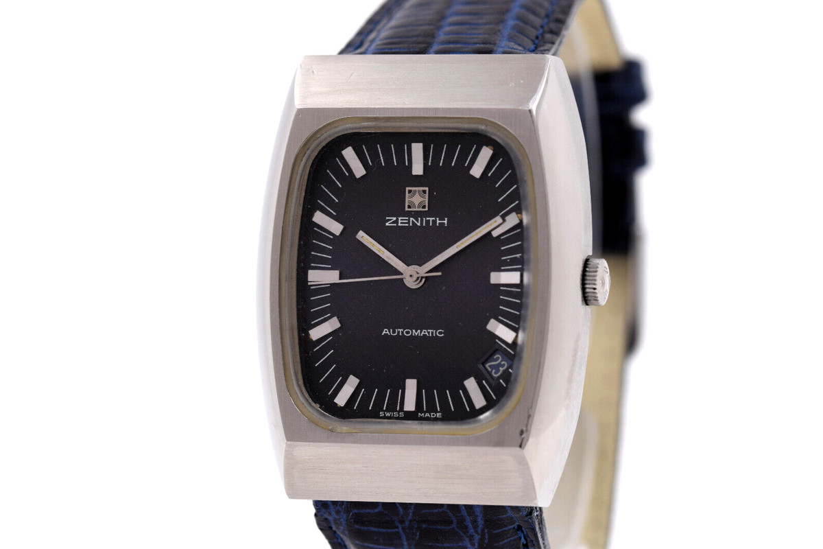 Vintage Zenith Watch Brand: ZenithModel: SurfReference: 01.0030.380 Caliber: 2572PCMovement: automatic Diameter (without crown): 33 x 43 mmLug to Lug: 22 mmLength Strap: 22.5 cmDial: blue-gray Crystal: mineralCase Material: stainless steelStrap Material: geunine leather, aftermarket, newCondition: good, workingYear: 70ies or 80iesBox: noPapers: no  All