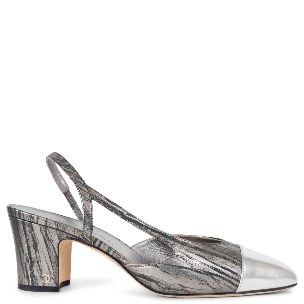 authentic Chanel slingback flats in marbled metallic silver leather with matching polished silver cap toes and subtle CC detail at the heel. Elegant almond-toe silhouette paired with a