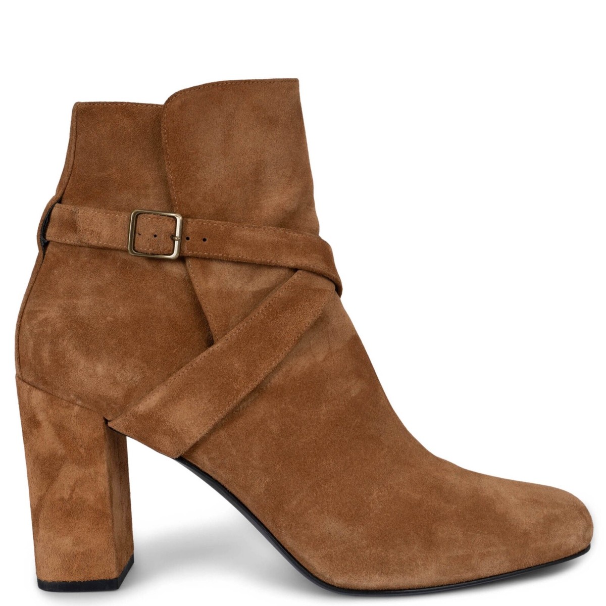 cognac brown suede are a chic addition to any wardrobe. They feature crisscross ankle straps with a small side buckle, almond toes, and suede-covered block heels adorned with the