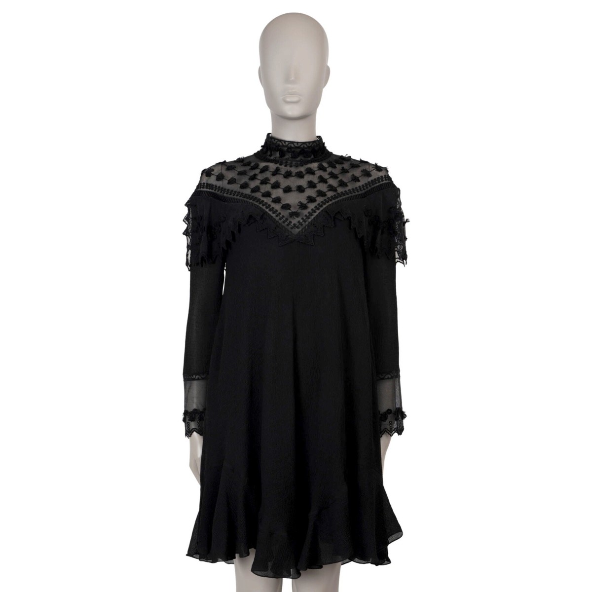 This authentic Chloé dress from 2018 combines romantic elegance with intricate details. Made from black crêpe silk, it features an embroidered lace panel and a relaxed, flared silhouette for effortless movement. The mock neck and long sleeves with lace-trimmed chiffon cuffs add sophistication, while braided trims and a broderie anglaise cape enhance its feminine charm. Perfect for special occasions, this slip-on dress offers timeless style and sustainable appeal as a second-hand piece.