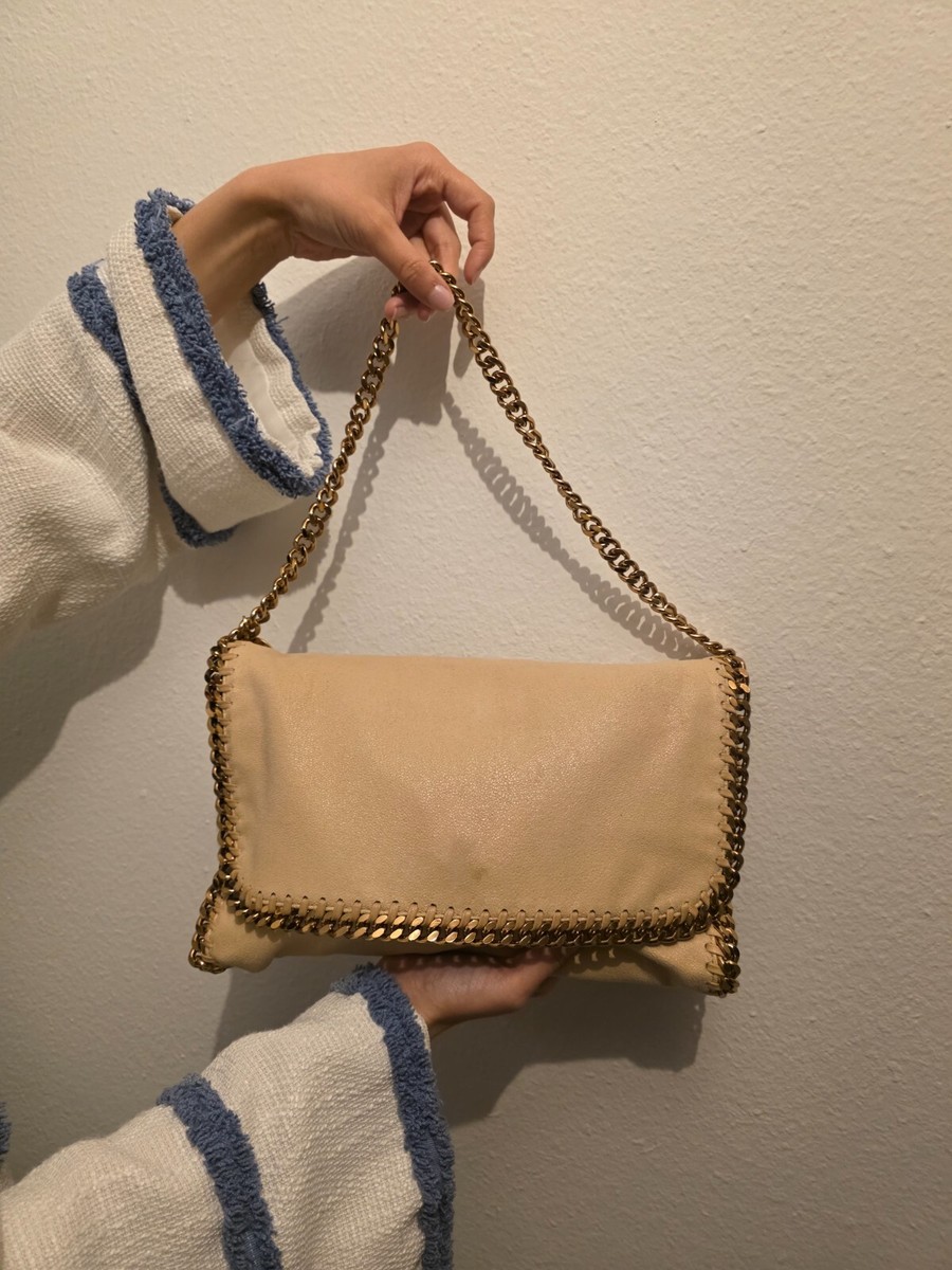 shoulder Bag. Mande from faux suede. Magnetic button closure and beige chain and stitching finish. Dimensions: Height 19 cm, Length 30 cm, Depth 5 cm. Come with: Original dust Bag. Round charm with embossed logo on the side. PS: (The bag has some small signs of wear/makeup on the front.)Â