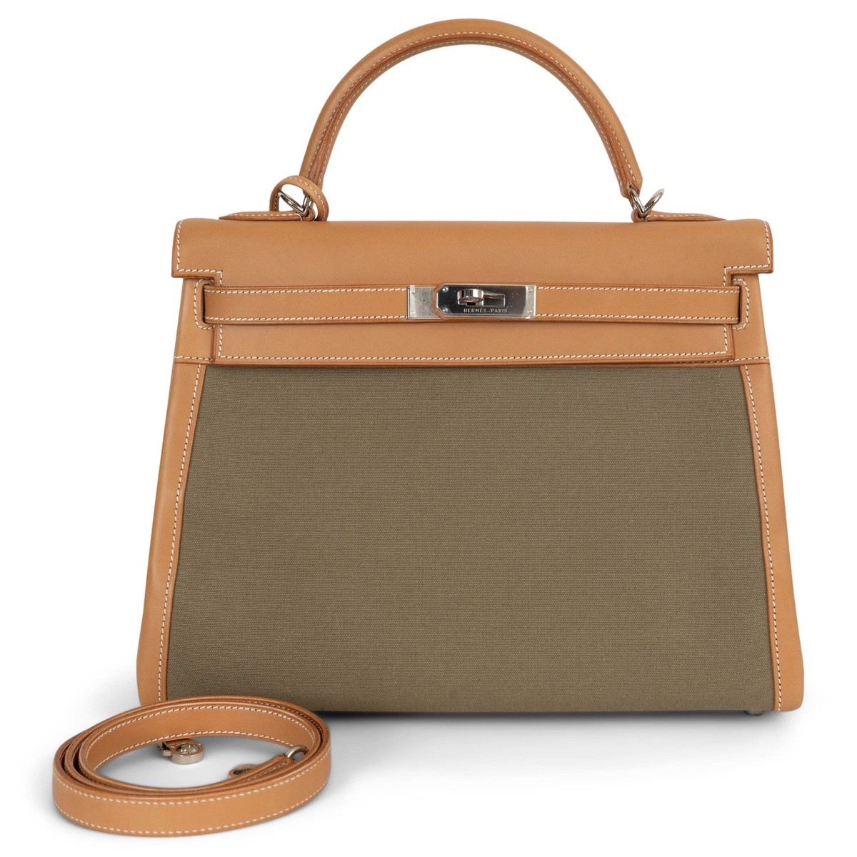 authentic Hermès Kelly 32 Retourne bag is a timeless icon crafted in a refined combination of Naturelle Vache leather and Khaki Toile canvas. The Retourne style features softer, rounded edges for a more relaxed silhouette while maintaining the structured elegance of the classic Kelly design. Sized at 32cm, this versatile bag offers ample space for daily essentials and is finished with palladium hardware. A true collector's piece, it exemplifies Hermès’ masterful craftsmanship and understated luxury. Has been carried once or twice and is in virtually new condition. Comes with dustbag and box. MeasurementsHeight23cm (9in)Width32cm (12.5in)Depth11cm (4.3in)Drop of the Handle8cm (3.1in)Shoulder Strap Length89cm (34.7in)HardwarePalladiumBlindstampK in a SquareShopZurich - RämistrasseAll our listings