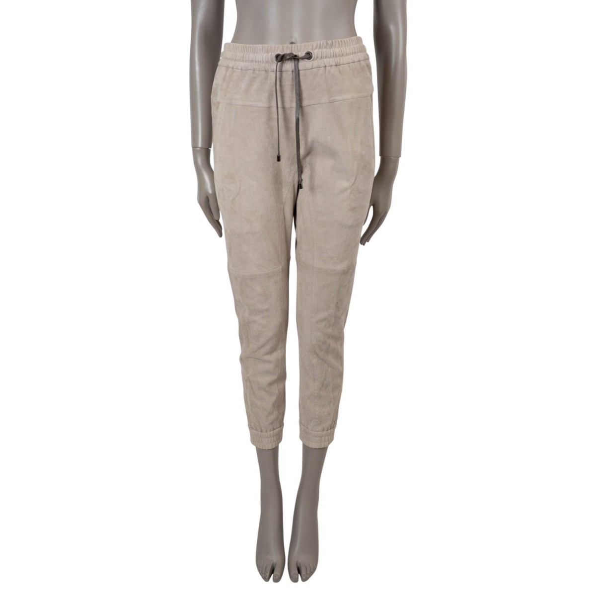 Découvrez une élégance décontractée avec ce pantalon authentique Brunello Cucinelli en daim. Confectionné en daim beige doux, il présente des jambes droites et courtes avec des poignets élastiques pour une tombée nette. La ceinture élastique avec cordon assure le confort, tandis que les poches latérales inclinées et une poche patch arrière ajoutent un style pratique.