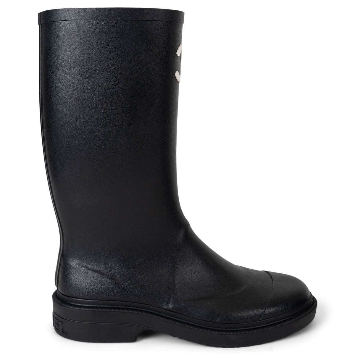 authentic Chanel iconic rain boots in black caoutchouc rubber embody practical elegance with the maison’s timeless touch. Designed with a mid-calf shaft and rounded toes, they are adorned with the signature white CC logo at the front for a bold statement. Finished with a small, logo-embossed block heel, these slip-on boots merge functionality with iconic style, perfect for elevating rainy-day dressing. Have been worn once and are in virtually new condition.2022 Fall/Winter debut - now REV CollectionMeasurementsModelChanREV G39620 X56326 94305Imprinted Size39Shoe Size39Inside Sole25.5cm (9.9in)Width8cm (3.1in)Heel3cm (1.2in)Shaft28cm (10.9in)Top Circumference34cm (13.3in)ShopZurich - RämistrasseAll our listings