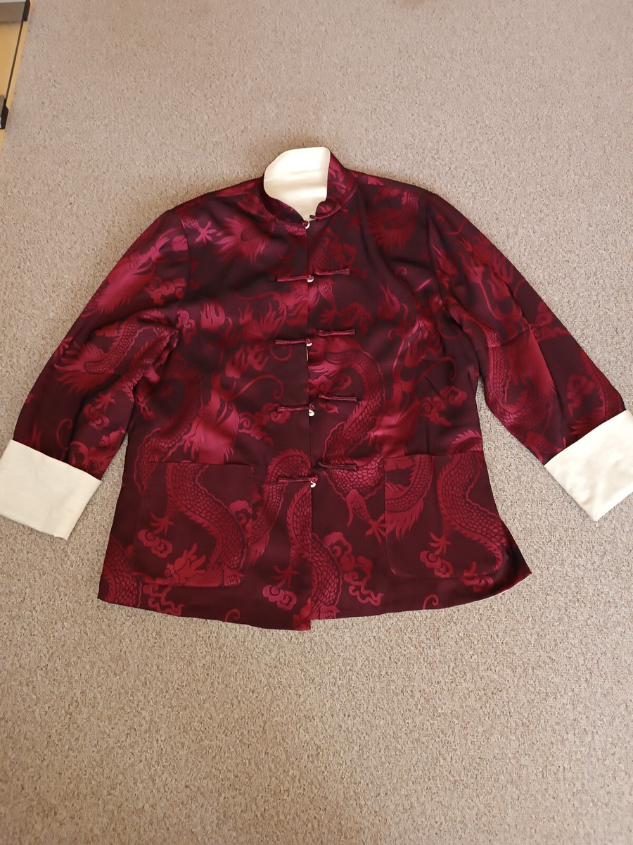 Damenjacke weinrot imchinesischen StilDiese sehr schöne weinrote Damenjacke ist aus China mitgebracht worden und nur sehr wenig getragen worden. Sie hat innen ein beiges Futter. Die Jacke hat einen Stehkragen und wird geknöpft. Sie hat zwei grosse Aussentaschen und zwei grosse Innentaschen. Die Ärmel kann man der entsprechenden Länge nach umschlagen. DieSchulterbreite beträgt 47 cm (siehe Foto). Die Rückenlänge beträgt 73 cm (siehe Foto) und die Armlänge beträgt 58 cm. Die Brustbreite unter den Armen gemessen beträgt 54 cm (siehe Foto). Kann auch mit TWINT bezahlt werden. Da Privatverkauf keine Garantie und keine Rücknahme.