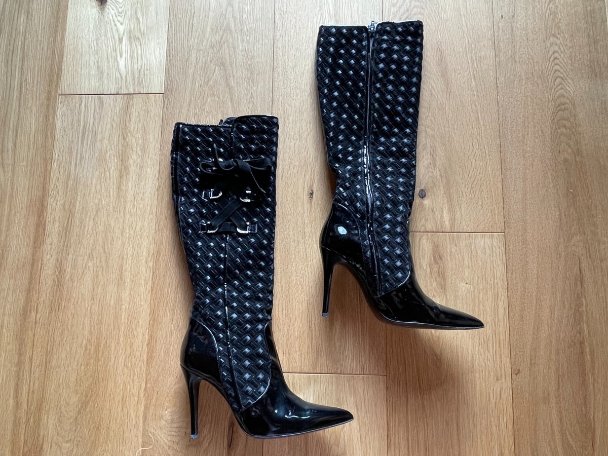 Fai colpo con questi stivali intrecciati vintage Versace, progettati per attirare tutti gli sguardi. Realizzati con un intreccio complesso per una texture e uno stile unici, aggiungono un tocco di lusso a qualsiasi outfit. Come articolo di seconda mano, supportano la moda sostenibile dando nuova vita a pezzi amati. Abbinali a jeans per un look casual chic o a un vestito per esaltare il tuo abbigliamento serale.