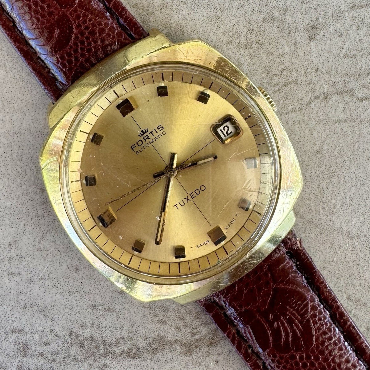Vintage Fortis Tuxedo Automatic wristwatch from the 1970s, Swiss made, with a gold-tone case and a classic sunburst champagne dial. It’s a handsome piece of mid-century design and a great example of Fortis’s dress watch style.Details: • Brand: Fortis • Model: Tuxedo • Movement: Automatic (self-winding mechanical) • Case: Gold-tone plated base metal, stainless steel screw-down back • Crystal: Acrylic • Dial: Sunburst champagne gold with applied square hour markers • Date: Quickset at 3 o’clock • Strap: Aftermarket