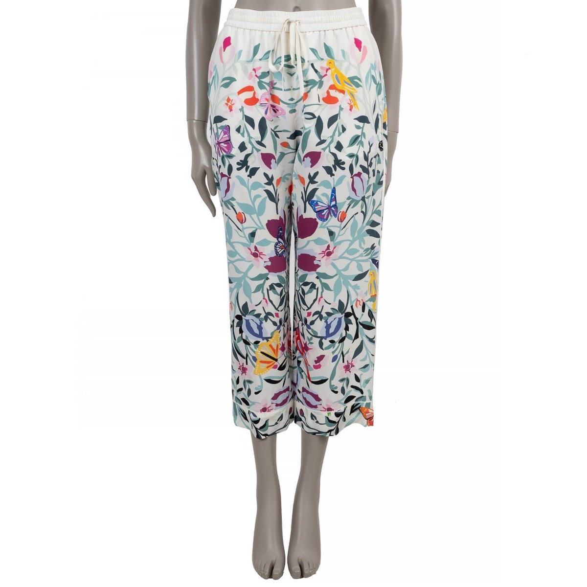 authentic Valentino pajama pants are crafted in white crepe silk with a colorful floral and butterfly print (please note the content and size tag are missing). They feature a relaxed silhouette with cropped straight legs, side slit pockets, and white piping for a refined finish. Slip-on style with an elastic drawstring waist ensures effortless comfort. Complete the look with the matching shirt, available in a separate listing. Have been worn and is in excellent condition.2022 ResortMeasurementsTag SizeMissingSizeSWaist72cm (28.1in) to 76cm (29.6in)Hips From102cm (39.8in)Length89cm (34.7in)Inseam65cm (25.4in)Rise25cm (9.8in)All our listings