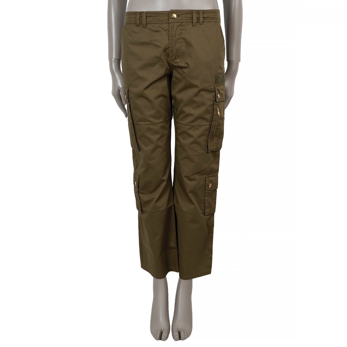 authentic Celine cargo pant is crafted from khaki green cotton (86%) and linen (14%), combining structure with breathable ease. Designed with a low-rise waist and straight-leg silhouette, it embodies the effortless yet utilitarian aesthetic of Celine’s modern tailoring. The pants feature four cargo flap pockets and one zip pocket on the sides, a velcro stripe detail, two side slant pockets, and two pockets at the back. They close with a gold-tone Triomphe button and concealed zipper. Unlined for lightweight comfort — a chic reimagining of military-inspired functionality through Celine’s minimalist lens. Have been worn and is in excellent condition.MeasurementsModel2Z552219I.02MKTag Size38SizeSWaist From82cm (32in)Hips From98cm (38.2in)Length96cm (37.4in)Inseam71cm (27.7in)Rise24cm (9.4in)ShopZurich - RämistrasseAll our listings
