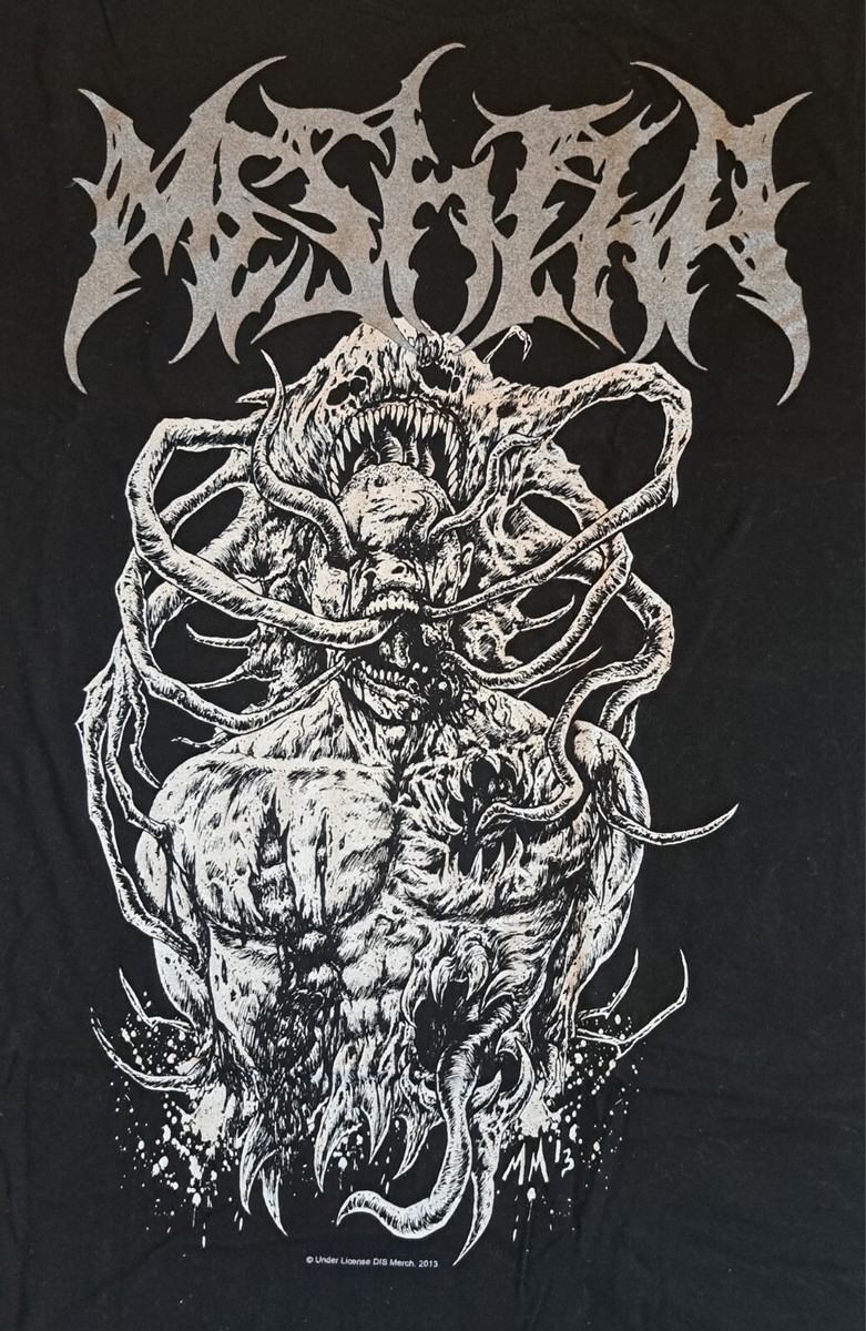 Dieses Second-Hand-MESHIHA-XL-T-Shirt zeigt auffällige Grafiken, inspiriert von Death-Metal-Bands wie Devourment und Disgorge, ideal für Fans extremer Musik. Hergestellt aus unbekannten Materialien, bietet es einen bequemen Sitz und einen einzigartigen, schrillen Stil. Perfekt für Konzerte, lässige Ausflüge oder um deinem Outfit eine rebellische Note zu verleihen. Pflegehinweise: auf links in kaltem Wasser waschen, um den Druck zu schützen.
