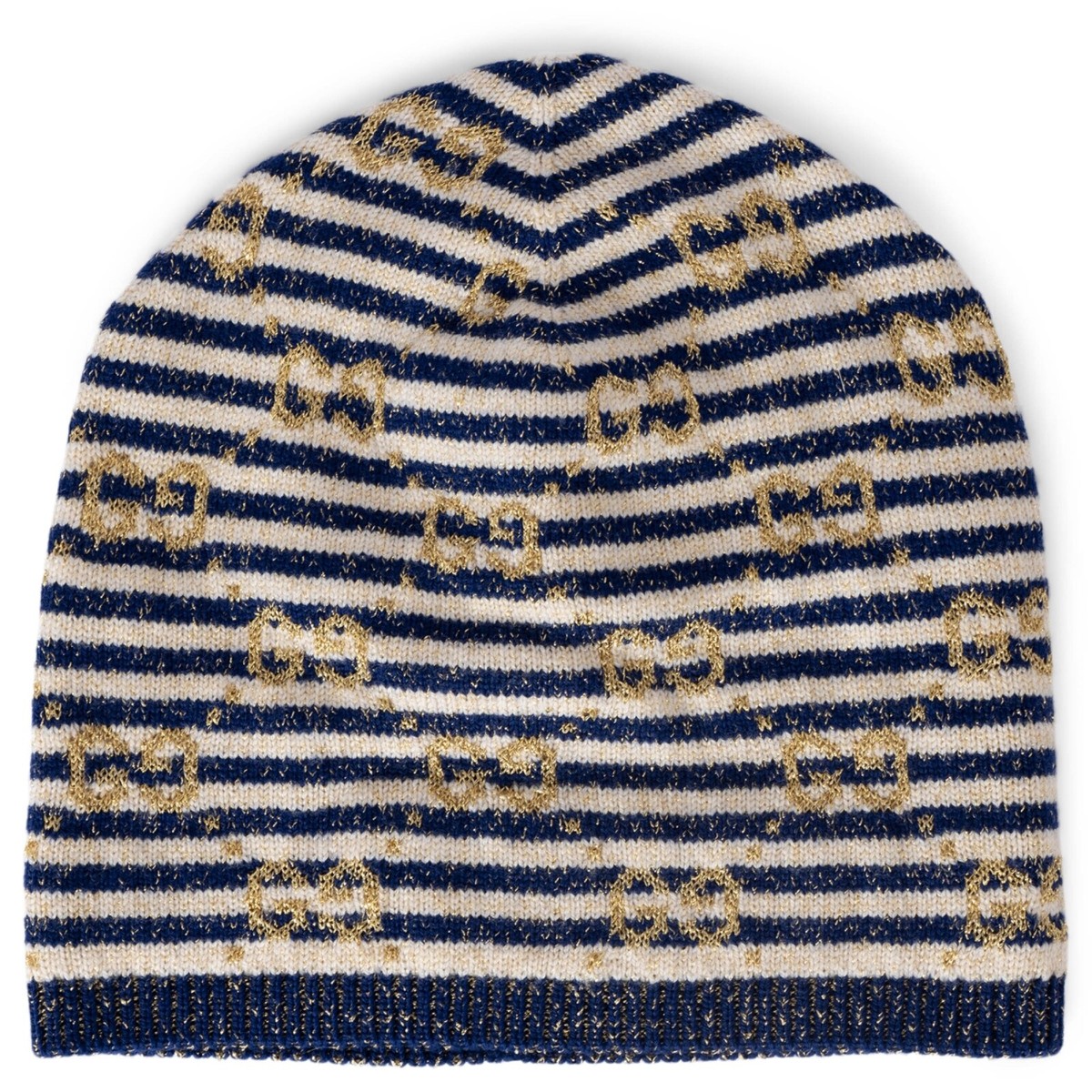 Stay warm and stylish with this authentic Gucci beanie, featuring a soft knit design in navy blue with cream and gold GG lamé accents. Made from a blend of materials for comfort, it offers a snug fit and iconic branding. Perfect for casual outings or adding a luxury touch to winter outfits.