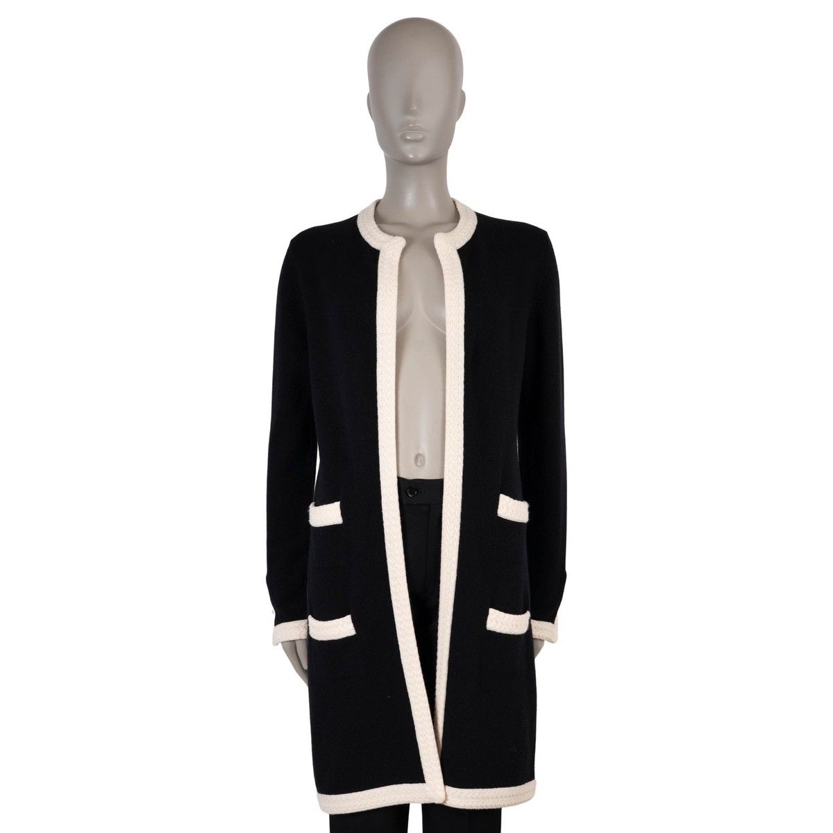 authentic Chanel knit coat is crafted in black cashmere (100%) with contrasting cream trim for a timeless two-tone effect. Designed in a relaxed, knee-length silhouette, it features four functional pockets and buttoned cuffs, combining practicality with refined elegance. The open-front style and unlined finish highlight the luxurious softness of cashmere, making it a versatile layering piece that embodies Chanel’s effortless sophistication. Has been worn and are in excellent condition. 2004 Fall/WinterMeasurementsModel04A P24406 W03385 B2580Tag Size42SizeLShoulder Width47cm (18.3in)Bust From110cm (42.9in)Waist From96cm (37.4in)Hips From112cm (43.7in)Length95cm (37.1in)Side Seam Length73cm (28.5in)Sleeve Length66cm (25.7in)All our listings include