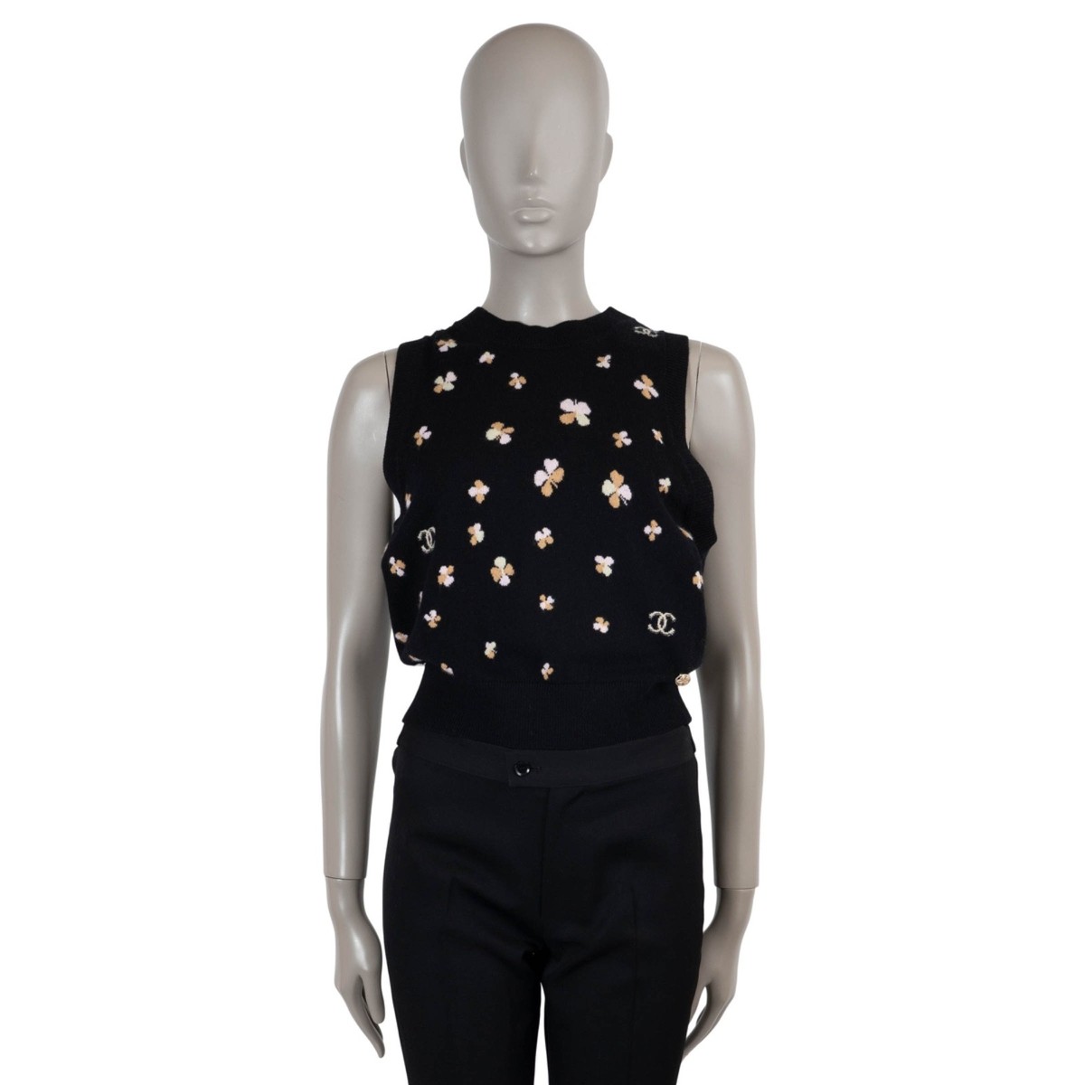 a charming blend of luxury and playful elegance. Crafted from ultra-soft cashmere, it features a black base adorned with a delicate CC and four-leaf clover motif in light pink, beige, and light yellow—adding a subtle pop of color and a touch of luck to your wardrobe. Embellished with a light gold-tone four-leaf clover CC logo button. The sleeveless silhouette and classic fit make it perfect for layering over shirts or under jackets, combining comfort with signature Chanel sophistication. Has been worn and is in excellent condition. 2024 Pre-SpringMeasurementsModel24P P76928 K11094 NV606Tag Size40SizeMShoulder Width30cm (11.7in)Bust From92cm (35.9in)Waist From86cm (33.5in)Hips From70cm (27.3in)Length51cm (19.9in)Side Seam Length25cm (9.8in)ShopZurich - RämistrasseAll our listings include only the listed item unless otherwise specified in the description above - Price includes US tariffs - for all other countries price does not include import duties & taxes - check your countries import laws prior purchase------------------------------------------------------------------------------------------------------------------------------------------ Terms & Conditions Luxury-Shops is not affiliated with any of the name-brand items we offer for sale.Warranties and Liabilites: Luxury-Shops declines all responsibility and cannot be held liable for any damages caused by the use of a specific garment.We also cannot be held responsible for the quality of an item (we are not the manufacturer) or any damages resulting from a manufacturing defect.No warranties of any kind are given or implied.Condition of Merchandise: Luxury-Shops offers for sale luxury top-quality products. We fully disclose the condition of each item. In the description of each product, Luxury-Shops will specify the conditions if different from the standards set by the market (Required disclosure of prior use)The main characteristics of products are shown in great detail (through numerous photographs and in-depth descriptions). The products offered for sale MAY NOT correspond to the real garments in terms of image and color because of the Internet Browser or Monitor used (color calibration). Luxury-Shops disclaims all responsibility.Every used item offered by Luxury-Shops has been cleaned and restored to the best possible condition unless noted otherwise. Every used or vintage handbag has been polished and refinished. Your purchases will be sent to you ready to be used or worn.Please be aware that vintage items may be delicate and may not be as resilient as a brand-new item. Please take appropriate care when using a vintage item. Damage to items after receipt or use by customers is not the responsibility of Luxury-Shops.Luxury-Shops is a reseller of authentic designer and vintage merchandise. We are not an authorised dealer and are not affiliated with the brands we sell on our site. Store-new designer items are only available from an authorised dealer or the actual store. Once the item leaves the authorised dealer with a customer, the item is considered pre-owned. However, items can be pre-owned and in new condition - that is, never used by the owner. Below are the definitions of the descriptions we use.NEW: in new condition, that is, never used. This means the item may have been purchased by us from an authorized dealer or a store. New items may also be pre-owned, that is, purchased by one of our consignors and never…