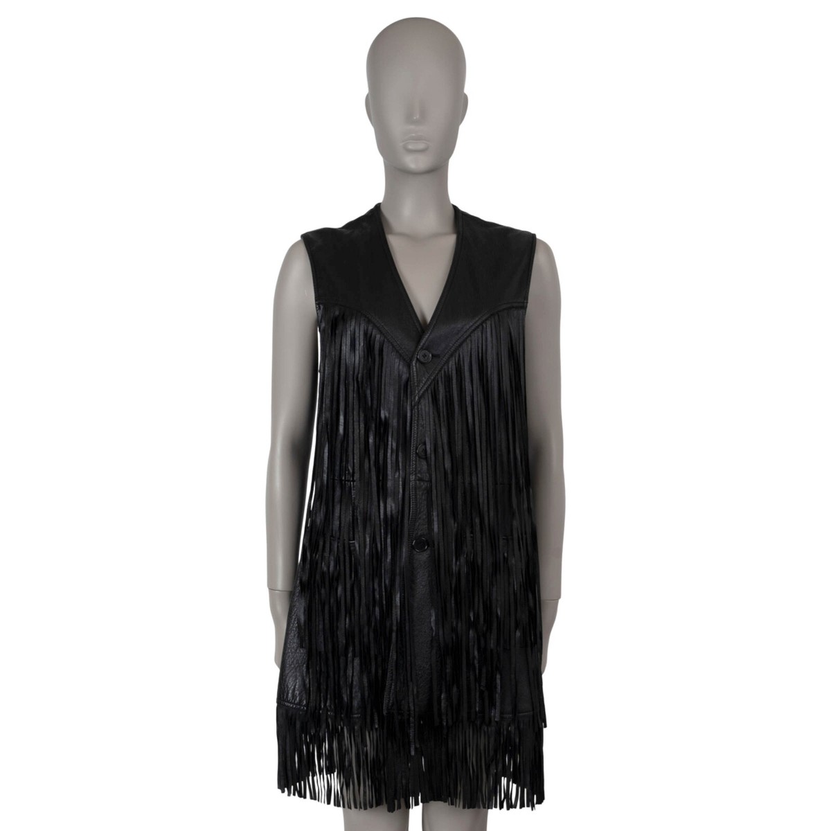 This authentic Saint Laurent black leather vest from 2016 features stylish fringe details, adding a rock-chic edge to any outfit. Crafted from genuine leather, it's a timeless piece that pairs well with jeans and boots for a casual yet sophisticated look. As a second-hand item, it supports sustainable fashion by extending the life of luxury goods.