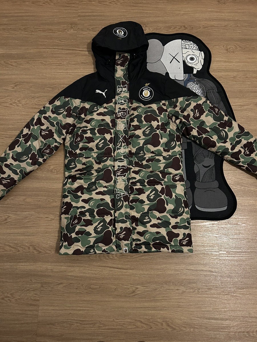 Stay warm and stylish with this second-hand Bape X Puma Camo Puffer Coat. Featuring a bold camouflage print and puffer design, it offers excellent insulation for cold weather. Ideal for casual outings or streetwear looks, this one-size coat combines comfort with iconic branding. As a pre-owned item, it supports sustainability by extending the life of fashion pieces. Pair with jeans and sneakers for a trendy urban outfit.
