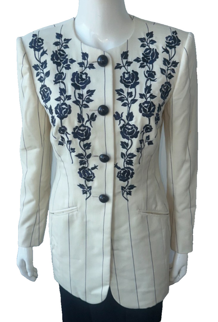 A skirt suit by Catherine Walker, the renowned British designer brand associated with the Princess of Wales, both Diana and Catherine, who have frequently worn her elegant creations for important royal engagements. Beautifully crafted and exquisitely tailored, the jacket features delicate hand embroidery. Princess Diana owned this jacket design without the embroidery, as well as another jacket by the same designer in red with a similar floral pattern. Made from fine wool and fully lined in silk satin. Made in England. Dry clean only. Approximately UK size 10 -12. Bespoke tailoring. A truly stunning example of exceptional British craftsmanship and timeless elegance. Buy at Ebay