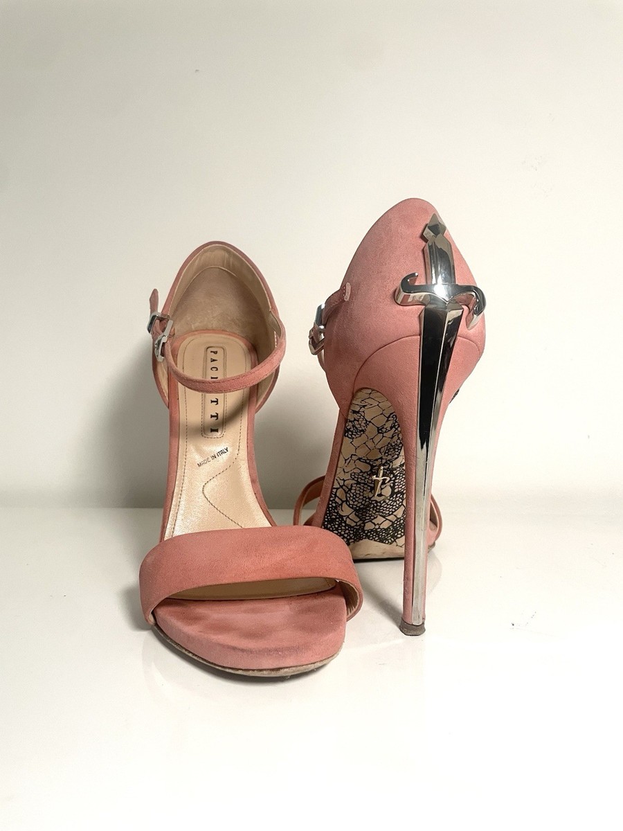 Make a bold statement with these Cesare Paciotti Dagger Heels, featuring the iconic Lady Blade design. Crafted for elegance and durability, these second-hand heels are in excellent condition, offering a sustainable choice by extending the life of luxury fashion. The precise fit corresponds to EU 40, US 9.5-10, and UK 7, ensuring comfort for various occasions. Pair them with tailored trousers or a little black dress to elevate your evening or formal wear.