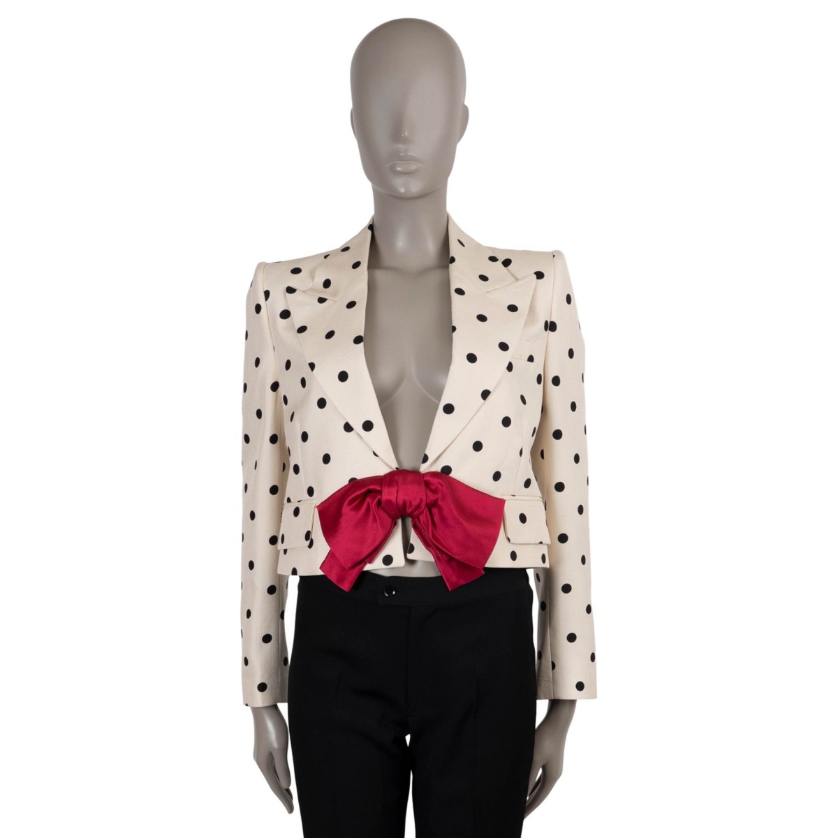 This authentic Valentino jacket combines timeless elegance with a playful twist. Crafted from 100% cream shantung silk, it features classic black polka dots and a statement pink Double Duchesse bow for a sophisticated yet bold look.