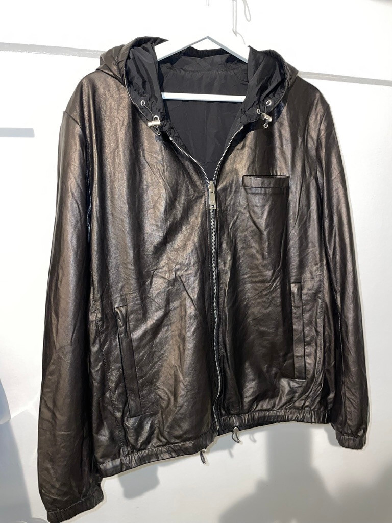 This reversible leather jacket from Prada offers versatile styling with two distinct looks in one piece. Crafted from high-quality leather, it features a durable construction and a classic fit that suits various occasions. As a second-hand item, it promotes sustainability by extending the life of luxury fashion. Wear it with jeans for a casual outing or layer over a dress for an elevated ensemble. Care for it by storing properly and cleaning with leather-specific products to maintain its condition.