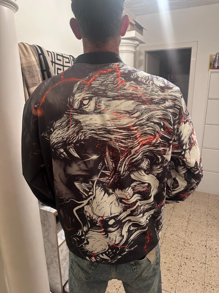 This lightweight bomber jacket features a bold wild wolf graphic, adding a touch of urban edge to your wardrobe. Designed by CALABRETTI, it's a second-hand find that promotes sustainability by extending the life of clothing. Perfect for casual outings or layering on cooler days, it offers a comfortable fit in size L. Style it with jeans and sneakers for a relaxed, trendy look.