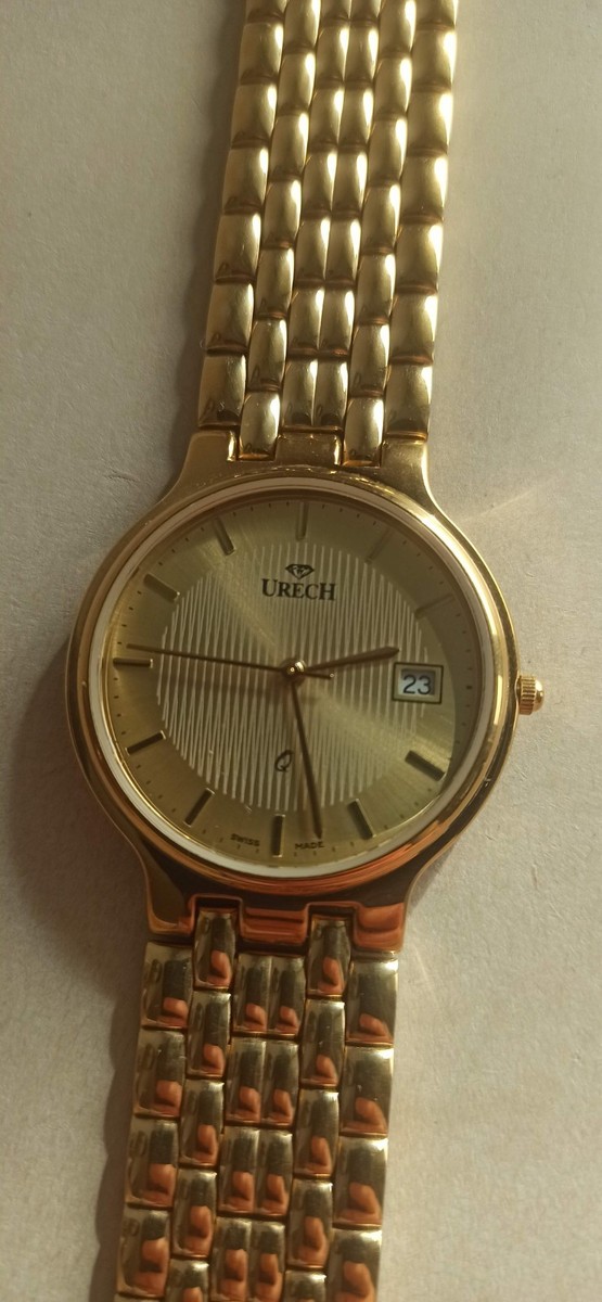 This Urech Quartz Swiss watch combines timeless elegance with reliable Swiss craftsmanship. Its gold-plated case and bracelet create a sophisticated look that works for both formal and casual occasions.