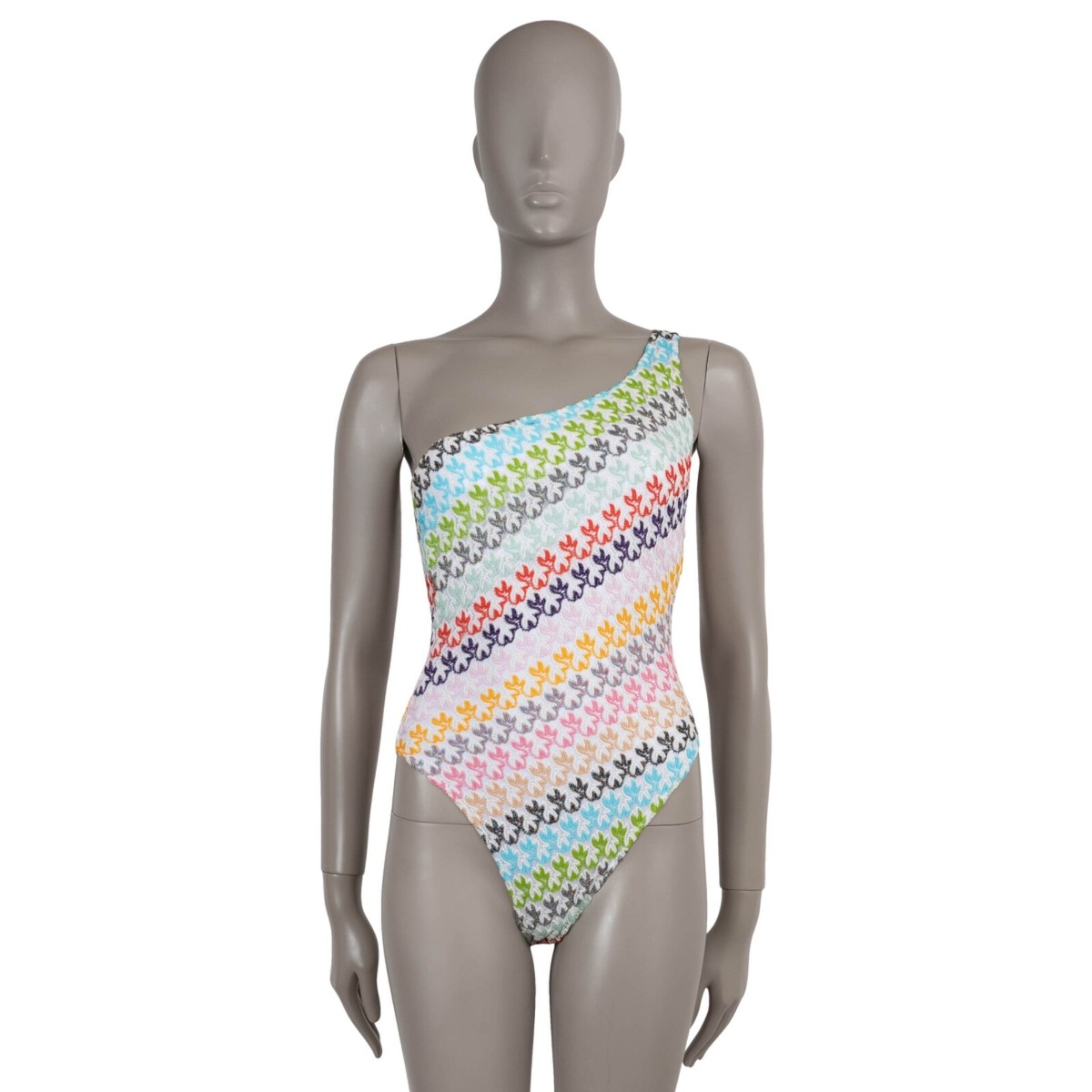 multicolor rainbow stripes in a blend of viscose (83%), cupro (11%), and polyester (6%)—please note the content and size tag are missing. It features a striking one-shoulder silhouette with high-cut sides for a leg-lengthening effect. A playful yet polished choice for