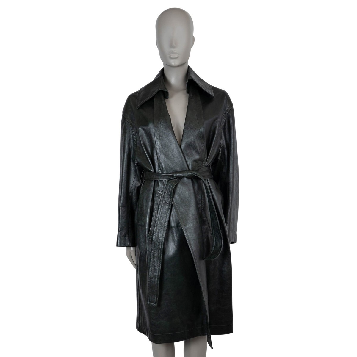 Ce manteau surdimensionné authentique Bottega Veneta est confectionné en cuir d'agneau vert forêt 100 %, offrant un éclat luxueux et une texture douce. Il présente une drape sculpturale mais fluide avec des épaules tombantes, des manches kimono et un col amovible pour des looks adaptables. Fermez-le avec la ceinture auto-nouante et utilisez les deux poches passepoilées pour plus de fonctionnalité. Doublé en viscose 100 %, il assure confort et facilité de port. Idéal pour faire sensation lors d'événements ou rehausser les tenues quotidiennes avec son design moderne inspiré des défilés.