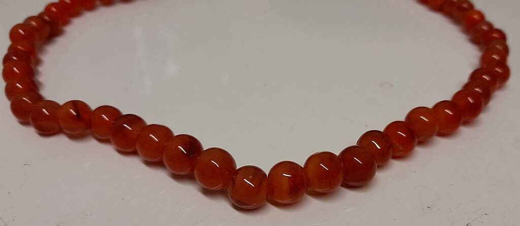 Ce collier de perles de cornaline est composé d'un rang de pierres d'agate polies, reconnues pour leur teinte chaude et rouge-orange. Fabriqué à partir de matériaux naturels, c'est une pièce d'occasion qui favorise la durabilité en redonnant vie à des bijoux aimés. La taille unique offre une longueur polyvalente, idéale pour des tenues décontractées ou bohèmes, ajoutant une touche d'élégance terreuse à votre look.