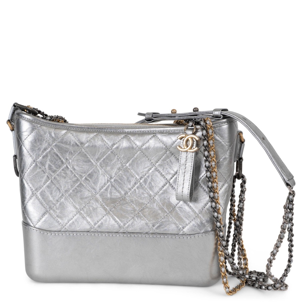 An iconic Chanel handbag with timeless appeal. This Gabrielle Medium Hobo combines modern design with classic craftsmanship in metallic silver aged calfskin.