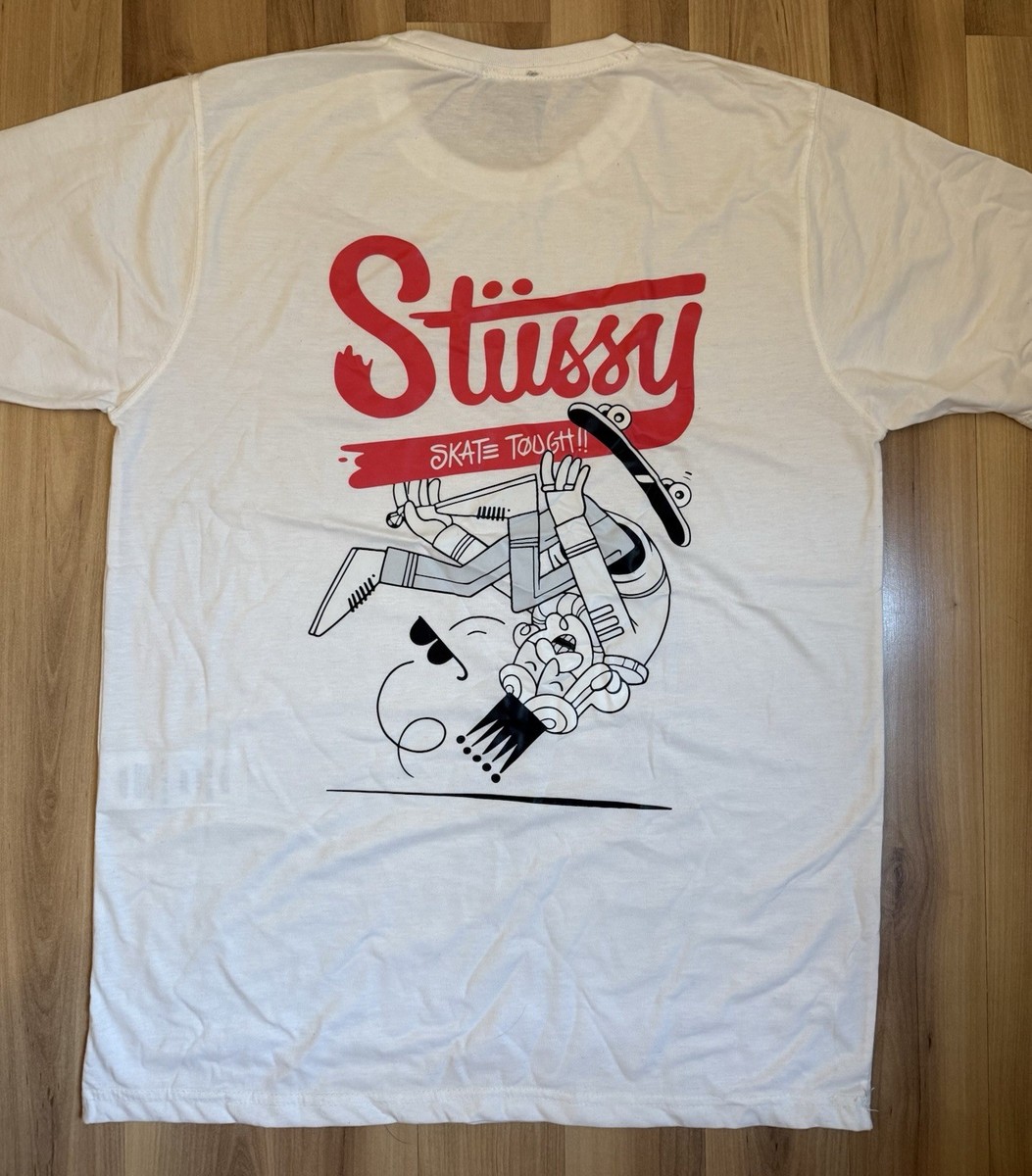 Maglietta Stüssy bianca in cotone – taglia XL (veste come L).Maglietta colore bianco con piccolo logo Stüssy rosso stampato sul petto. Grande stampa posteriore con logo Stüssy rosso e grafica skateboard “Skate Tough!!”. Vestibilità classica, tessuto in cotone morbido e confortevole. Condizioni nuove (mai usata).