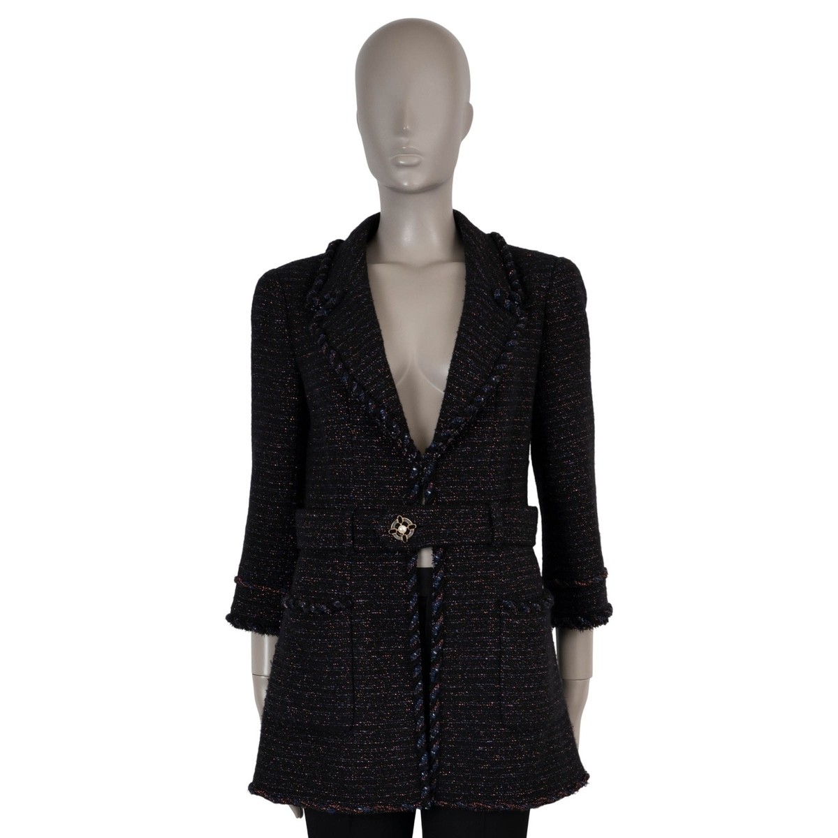 authentic Chanel coat is crafted from a luxurious black tweed blend of wool (61%), acrylic (13%), cashmere (9%), acetate (8%), cotton (6%), and nylon (3%), enriched with blue, metallic pink, and silver lurex speckles for a subtle shimmer. Designed with a sophisticated fitted silhouette, it features notched lapels, 3/4 sleeves, two patch pockets, and signature twisted trim detailing. The front closes with concealed hooks and a matching tweed belt adorned with an ornate brooch in faux pearl, glass, and enamel. Lined in a smooth blend of silk (66%) and elastane (14%), this Chanel creation combines timeless tailoring with signature house embellishment. A striking collector’s piece that seamlessly transitions from day to evening. Has been worn and are in excellent condition. 2007 Paris-Monte Carlo Metiers d'ArtMeasurementsModelChanel07A P31332 V19775 M4806Tag Size40SizeMShoulder Width42cm (16.4in)Bust From92cm (35.9in)Waist From80cm (31.2in)Hips From98cm (38.2in)Length75cm (29.3in)Side Seam Length53cm (20.7in)Sleeve Length47cm (18.3in)Belt Length From100cm (39in)All our listings