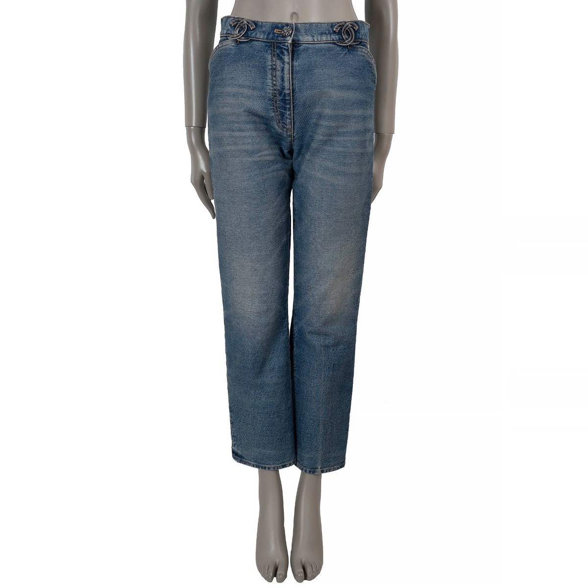 authentic Chanel jeans in blue washed denim (100% cotton), designed with a timeless straight-cut leg and classic five-pocket styling. The signature CC belt loops add a distinctive Chanel touch, while a crystal-encrusted button closure elevates the design with subtle glamour. Finished with a concealed front zipper. Unlined for a lightweight, natural drape. Style them effortlessly with the matching denim top for a coordinated look or pair with a tweed jacket for iconic Parisian chic. Have been worn and is in excellent condition.2024 Spring/SummerMeasurementsModel24S P76791 V69116 NX158Tag Size36SizeXSWaist From74cm (28.9in)Hips From94cm (36.7in)Length98cm (38.2in)Inseam72cm (28.1in)Rise27cm (10.5in)ShopZurich - RämistrasseAll our listings