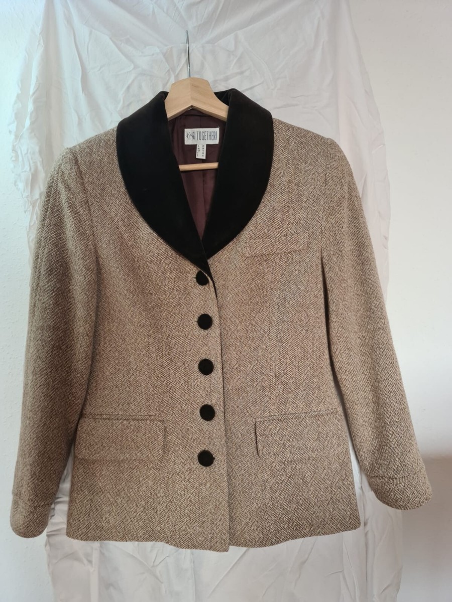 Abbraccia uno stile senza tempo con questa giacca da equitazione vintage anni '80, caratterizzata da un corpo in tweed di lana classico e un collo in velluto morbido per un tocco di eleganza. Realizzata con materiali durevoli, offre una vestibilità su misura perfetta per uscite casual o occasioni smart-casual. Come pezzo di seconda mano, supporta la sostenibilità dando nuova vita alla moda già amata. Abbinala ai jeans per un look rilassato o vestila con pantaloni per un outfit curato.