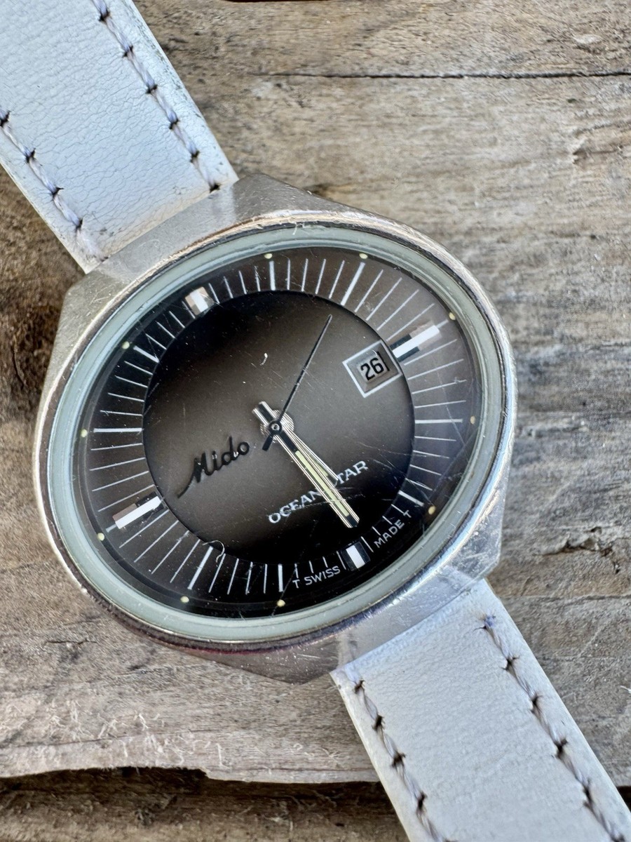 Questo orologio da polso automatico vintage Mido Ocean Star è un cronometro svizzero classico, perfetto per i collezionisti. Funziona ma necessita di manutenzione per prestazioni ottimali, con un meccanismo di carica e regolazione rigido. La cassa in acciaio inossidabile misura circa 30 mm di diametro e mostra graffi dovuti all'età, mentre il vetro acrilico è graffiato. Il quadrante e le lancette sono in buone condizioni originali, ma il cinturino in pelle aftermarket deve essere sostituito.