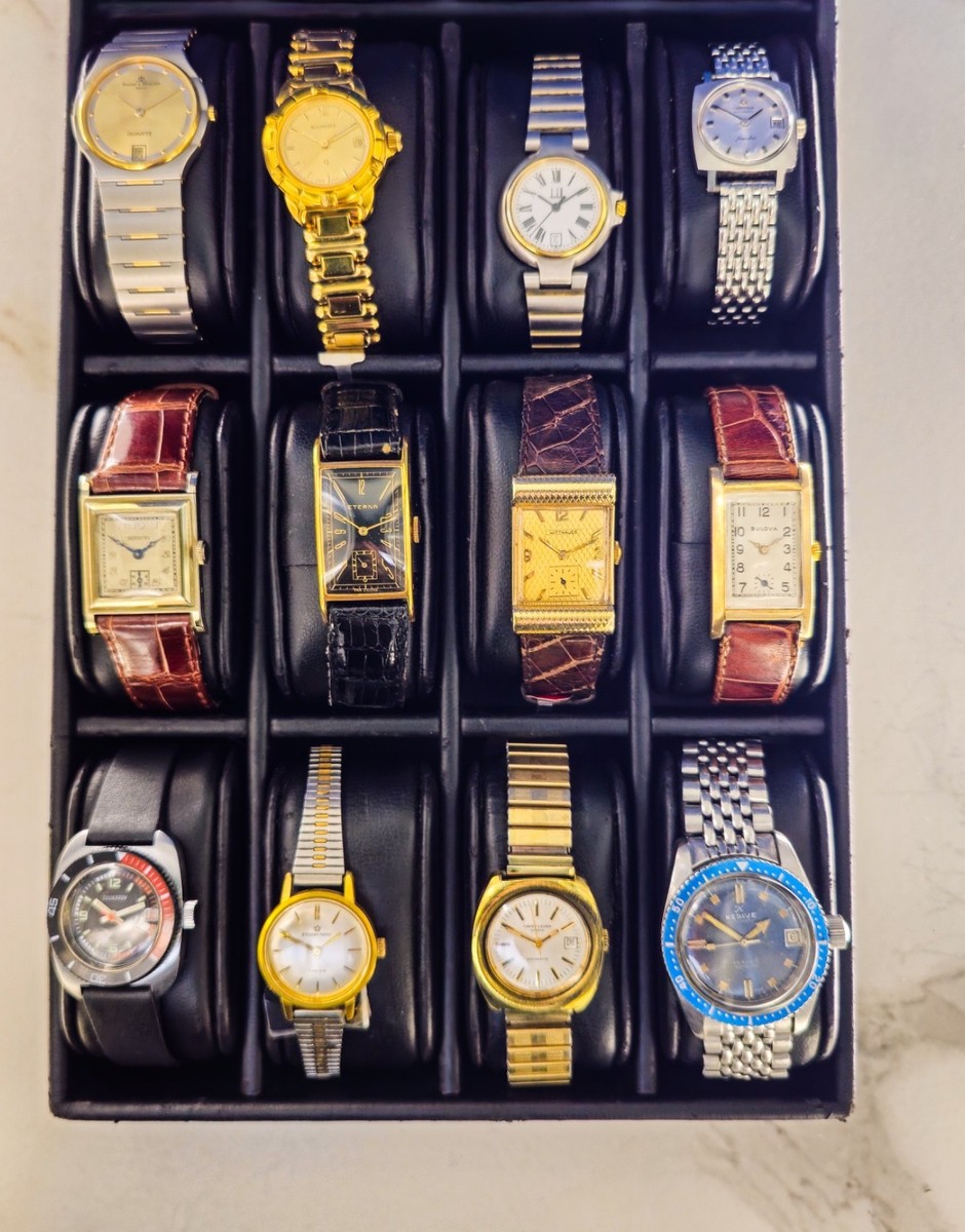 OROLOGI VINTAGE E MODERNI PERFETTAMENTE FUNZIONANTI SWISS MADEFAI LA TUA OFFERTAVISIBILI DI PERSONA A LUGANOMettiamo in vendita lotto intero di 12 orologi Swiss Made dei seguenti marchi in ordine in foto:SQUADRON: cassa in acciaio, ghiera bicolore nero/rosso e bidirezionale, diametro 27mm, quadrante nero con lancette luminescenti, datario ore 3, cinturino in gomma nera, movimento meccanicoETERNA MATIC: Cassa acciaio, lunetta placcata oro, diametro 24mm, quadrante argentèe con indici e lancette in oro, bracciale in acciaio e placcato oro con chiusura a gancio, movimento meccanicoFAVRE-LEUBA GENEVE: Cassa acciaio, diametro 26mm, quadrante argentèe con indici e lancette dorate, datario a ore 3, bracciale a molla in acciaio, movimento meccanicoKEDIVE: cassa in acciaio, ghiera blu bidirezionale, diametro 33mm, quadrante blu con indici applicati a ore 12 e 6, datario ore 3, qualche numero mancante su datario, bracciale in acciaio a maglie con chiusura deployante, movimento meccanicoNOVELTI:cassa in oro 14k, diametro 24mm, quadrante quadrato champagne con numeri arabi argentati applicati e lancette azzurrate, piccoli secondi a ore 6, cinturino in coccodrillo marrone, movimento meccanicoETERNA: cassa in Oro 18k, diametro 19mm, quadrante rettangolare nero con numeri arabi e lancette in oro, piccoli secondi a ore 6, cinturino in coccodrillo nero, movimento meccanicoWITTENAUER: cassa in Oro 14k, diametro 21mm, quadrante in oro con lavorazione a rombi, numeri e indici applicati, lancette in oro, cassa con lavorazione che riprende rombi del quadrante, piccoli secondi a ore 6, cinturino in coccodrillo marrone, movimento meccanicoBULOVA: cassa placcata oro, diametro 20mm, quadrante argentèe con numeri romani neri e piccoli secondi a ore 6, cinturino in pelle marrone, movimento meccanicoBAUME&