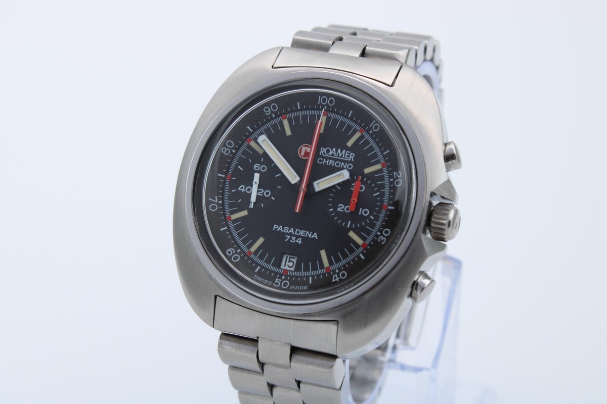 Questo Roamer Pasadena 734 Cronografo è un vero orologio vintage degli anni '70, alimentato dal movimento affidabile Valjoux 7734. Con un diametro della cassa di 44mm (senza corona) e il numero di riferimento 734-9120.608, offre funzionalità cronografo classiche in condizioni eccellenti.