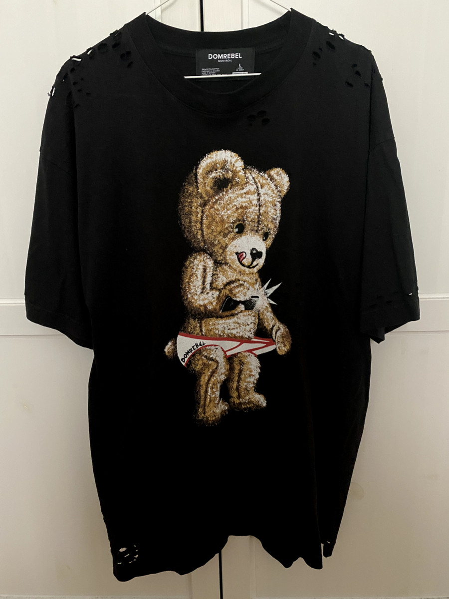 Questo T-shirt di seconda mano unico presenta un design ispirato al teddy con buchi intenzionali per un look ribelle e audace. Realizzato con materiali sconosciuti, è un pezzo forte che promuove la sostenibilità attraverso il riutilizzo. Indossalo per uscite casual o per aggiungere un tocco audace al tuo guardaroba.