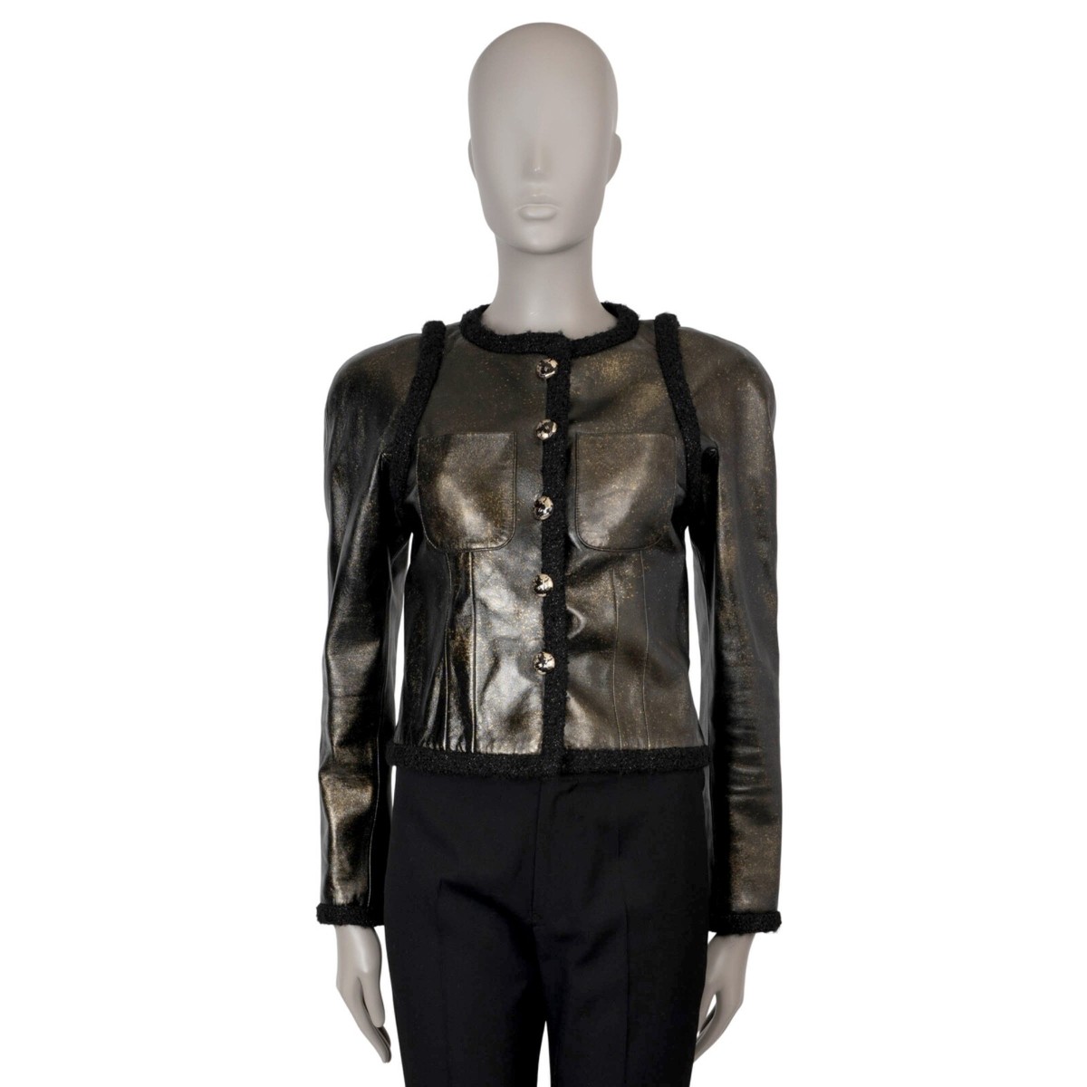 Diese authentische Chanel-Jacke vereint Luxus und Stil mit ihrem schwarzen und goldenen 17K-Tweedbesatz und metallischen Lederakzenten. Hergestellt für einen raffinierten Look, bietet sie eine Grösse 36 XS, ideal für besondere Anlässe oder elegante Events. Als Secondhand-Artikel unterstützt sie nachhaltige Mode, indem sie einem geliebten Stück neues Leben verleiht. Kombiniere sie mit taillierten Hosen oder einem klassischen Kleid für ein elegantes Outfit.