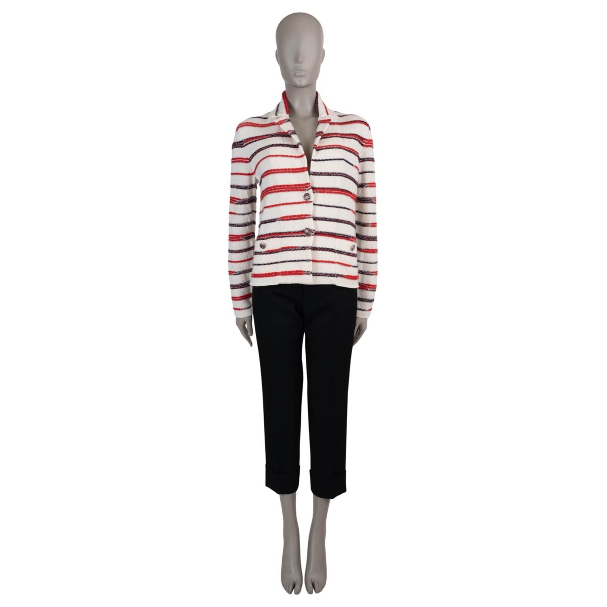 Diese authentische gestreifte Strickjacke vereint Luxus und Komfort mit ihrer weichen Kaschmir-Mischung. Mit einem klassischen weißen, roten und blauen Streifenmuster ist sie ideal zum Schichten bei kühlerem Wetter. Hergestellt aus hochwertigen Materialien, bietet sie einen zeitlosen Look, der sich gut mit Jeans oder schicken Hosen für einen schicken, lässigen Stil kombinieren lässt. Als Second-Hand-Artikel unterstützt sie nachhaltige Mode, indem sie einem bereits geliebten Stück neues Leben schenkt.