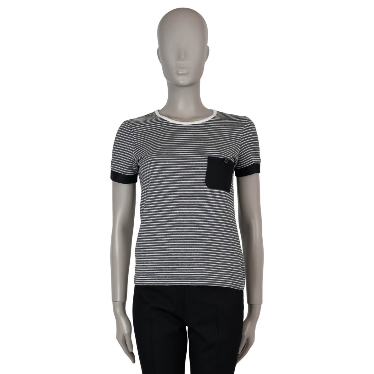 Dieses authentische Chanel T-Shirt besticht durch ein auffälliges schwarz-weiß-silbernes Streifendesign mit 03A Lurex-Akzenten für einen dezenten Schimmer. Hergestellt aus hochwertigen Materialien, bietet es einen bequemen Sitz in Größe XS, perfekt, um Casual- oder Abendoutfits eine Note Luxus zu verleihen. Als Second-Hand-Artikel unterstützt es nachhaltige Mode, indem geliebte Stücke ein neues Leben erhalten.