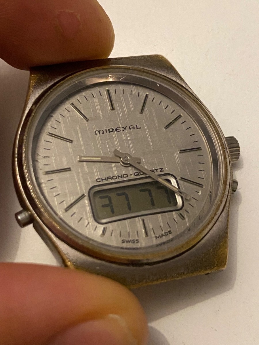 Diese Mirexal Herren-Chrono-Quarzuhr mit präzisem ESA ETA 900.231 Y2 Werk gewährleistet zuverlässigen Zeitbetrieb bei korrekt sitzendem Batteriekontakt. Das Gehäuse misst 34mm im Durchmesser (37mm mit Krone) und bietet eine klassische Größe für den Alltag. Beachten Sie, dass das LCD-Display Fehlfunktionen aufweist, es geht an und aus, ideal für Reparaturbegeisterte oder als Ersatzteillieferant. Der Second-Hand-Zustand fördert Nachhaltigkeit durch Verlängerung der Produktlebensdauer.