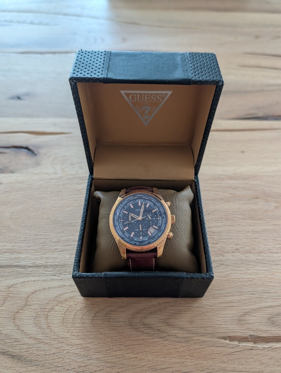 Diese Guess Pursuit Herrenuhr, Modell W0500G1, vereint sportliche Eleganz mit robusten Merkmalen. Gefertigt aus Edelstahl mit Mineralglas, verfügt sie über eine Chronograph-Anzeige und ist wasserdicht bis 5 ATM, ideal für den täglichen Gebrauch und leichte Wasseraktivitäten. Die Uhr wird mit Originalbox geliefert und ist in sehr gepflegtem Zustand, da sie nur wenig getragen wurde. Die Batterie ist leer durch Lagerung, lässt sich aber einfach ersetzen. Ihr zeitloses Design passt perfekt zu lässigen wie smarten Anlässen.
