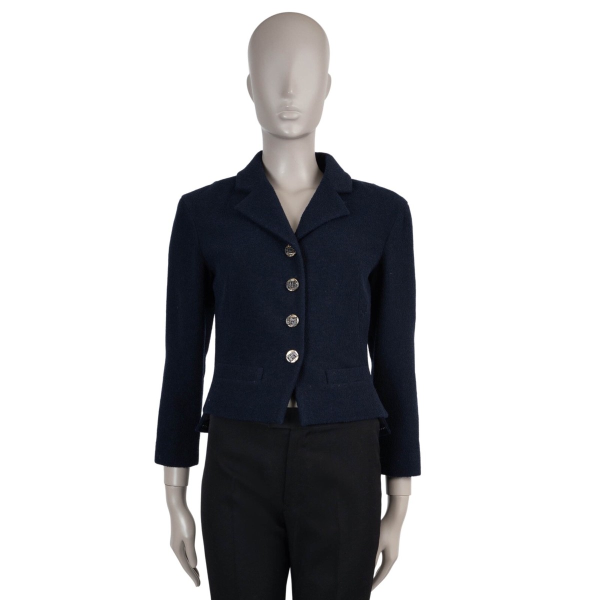 Diese authentische Chanel-Kurztweedjacke vereint zeitlose Eleganz mit moderner Passform. Hergestellt aus hochwertiger Wolle, bietet sie Wärme und Langlebigkeit für verschiedene Anlässe. Der marineblaue Farbton und das klassische Tweedmuster machen sie zu einem vielseitigen Stück, das sich gut mit Hosen oder Röcken für einen raffinierten Look kombinieren lässt. Als Secondhand-Artikel unterstützt sie nachhaltige Mode, indem sie die Lebensdauer von Luxusgütern verlängert.