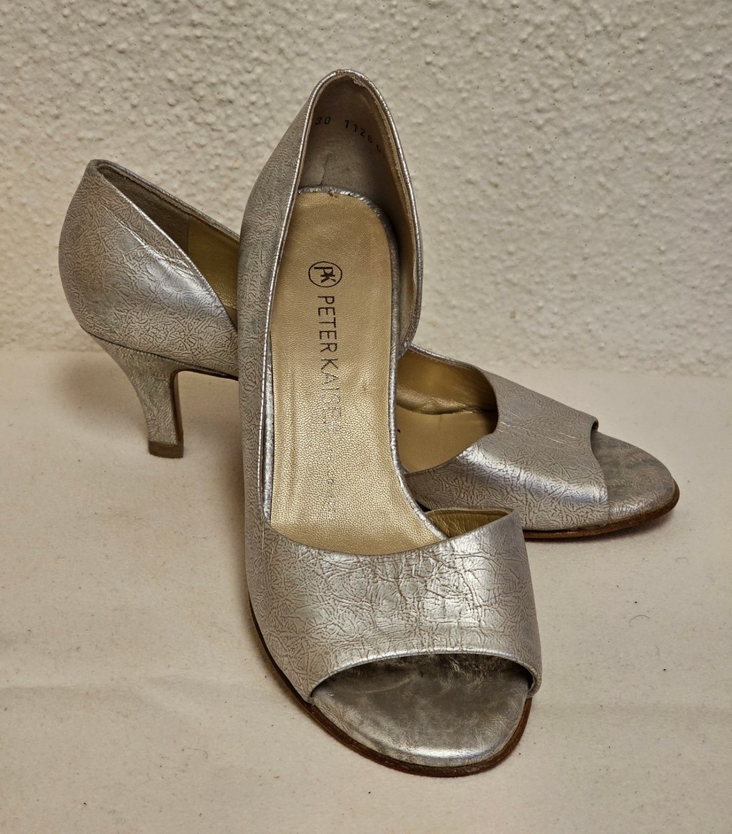 Verleihen Sie Ihrem Abendoutfit mit diesen eleganten Peter Kaiser Pumps aus echtem Leder und einem dezenten metallischen Silberfinish einen besonderen Glanz. Mit einem klassischen Open-Toe-Design und einem bequemen Mittelabsatz von etwa 2 1/4 Zoll bieten sie Stil und Komfort durch weiche Lederfutter. Perfekt für Hochzeiten, Partys oder besondere Anlässe, sind diese Second-Hand-Schuhe in sehr gutem Zustand mit leichten Abnutzungsspuren an den Sohlen.