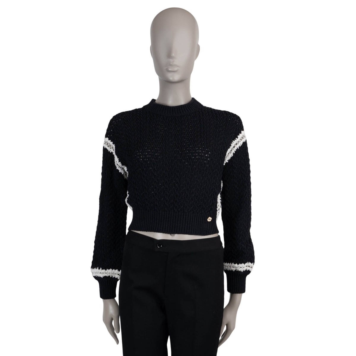 Dieser gehäkelte Cropped-Pullover aus Chanels 22C Dubai Kollektion besteht aus einer Mischung aus Seide und Baumwolle für ein weiches, atmungsaktives Tragegefühl. Der cropped Schnitt und die lockere Passform eignen sich perfekt zum Schichten über hoch taillierte Hosen oder Röcke, ideal für schicke Freizeitoutfits. Als Second-Hand-Artikel unterstützt er nachhaltige Mode, indem er diesem Luxusstück ein neues Leben schenkt.